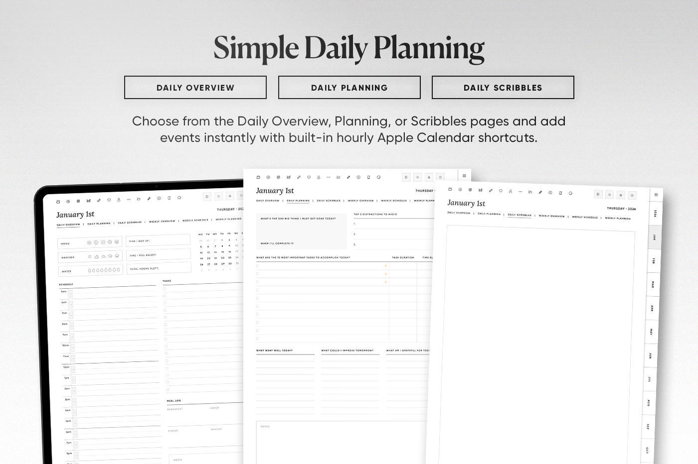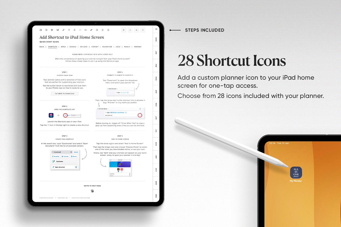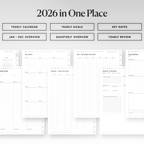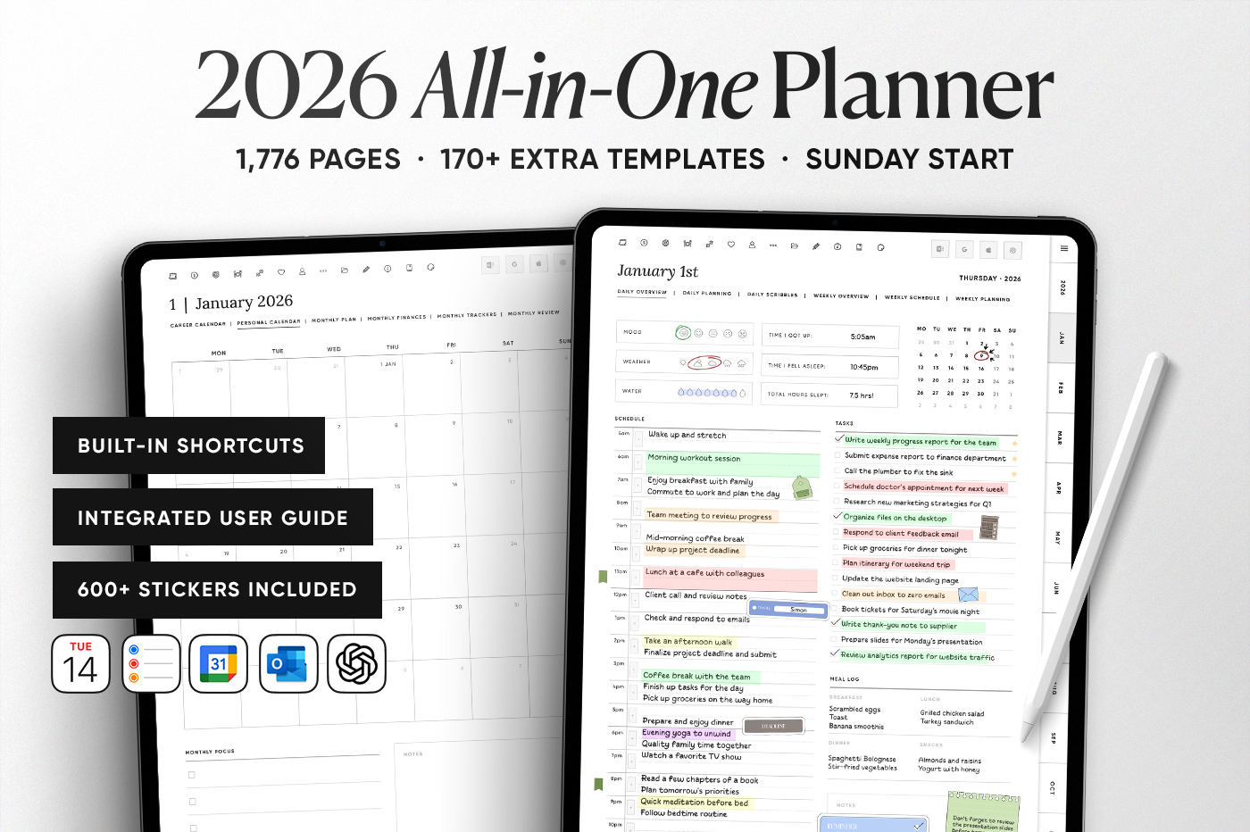The 2026 All-in-One Planner keeps your year organised in one place with daily, weekly, monthly, and yearly pages in multiple styles so you can plan your way. This planner is fully hyperlinked for fast navigation, includes 600+ stickers, and has built-in shortcuts for Apple Calendar, Google Calendar, Outlook, and ChatGPT. Clean, practical, and made to keep you consistent all year.