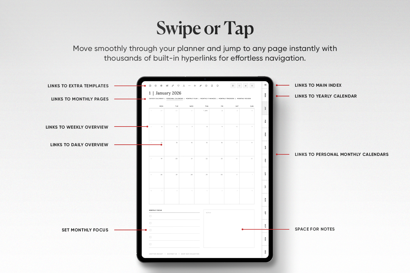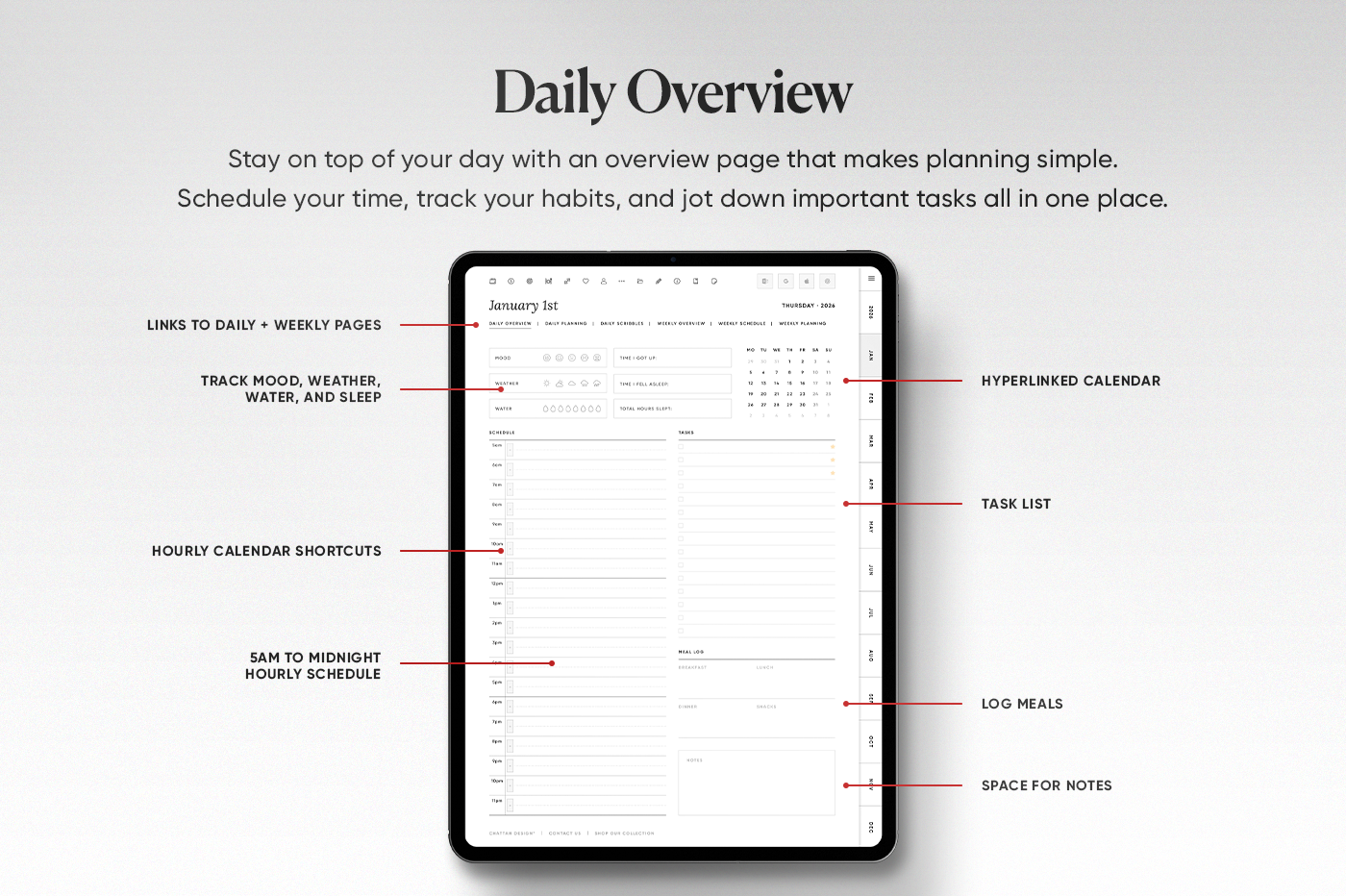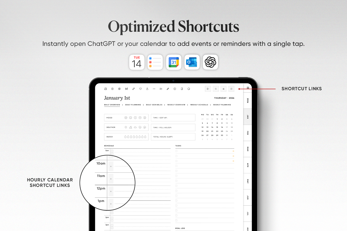The 2026 All-in-One Planner keeps your year organised in one place with daily, weekly, monthly, and yearly pages in multiple styles so you can plan your way. This planner is fully hyperlinked for fast navigation, includes 600+ stickers, and has built-in shortcuts for Apple Calendar, Google Calendar, Outlook, and ChatGPT. Clean, practical, and made to keep you consistent all year.