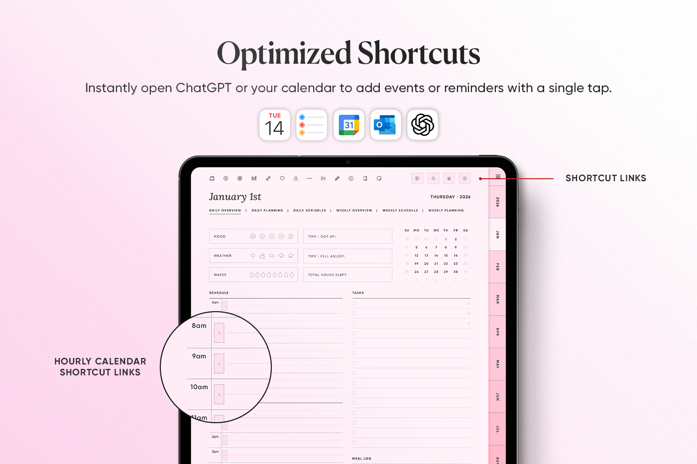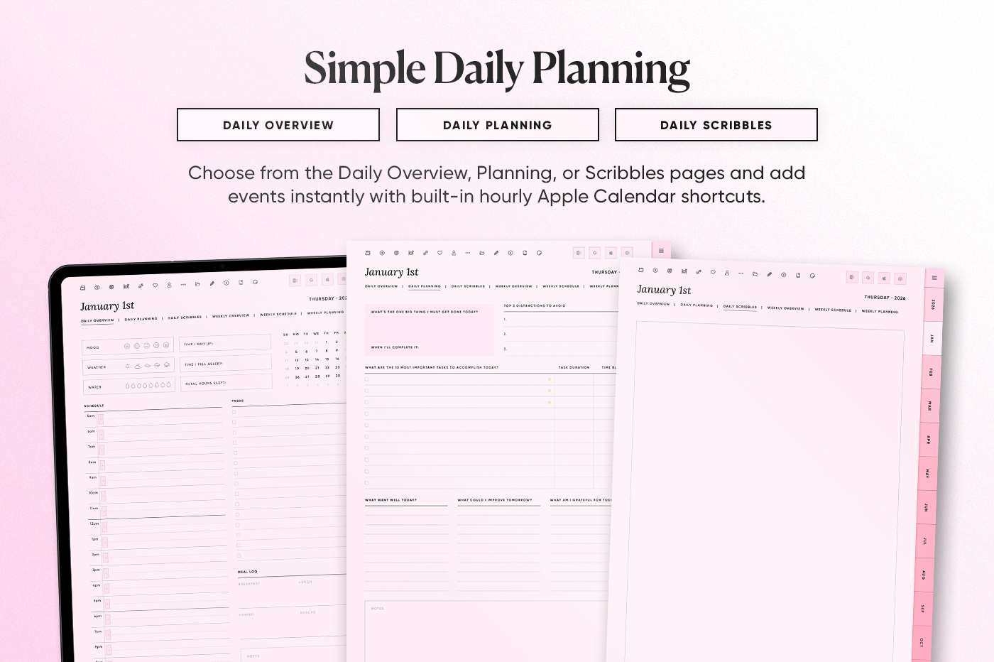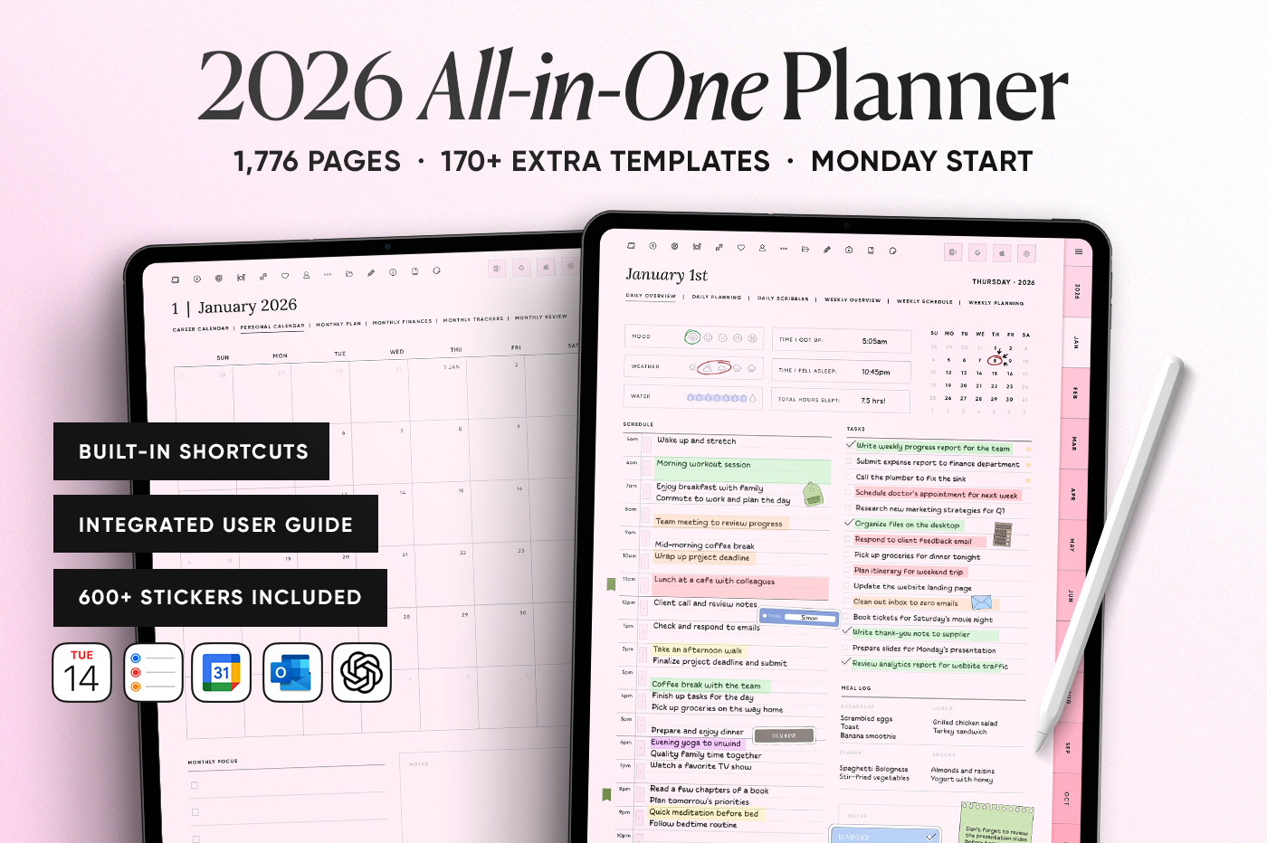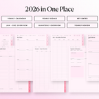 The 2026 All-in-One Planner keeps your year organised in one place with daily, weekly, monthly, and yearly pages in multiple styles so you can plan your way. This planner is fully hyperlinked for fast navigation, includes 600+ stickers, and has built-in shortcuts for Apple Calendar, Google Calendar, Outlook, and ChatGPT. Clean, practical, and made to keep you consistent all year.