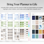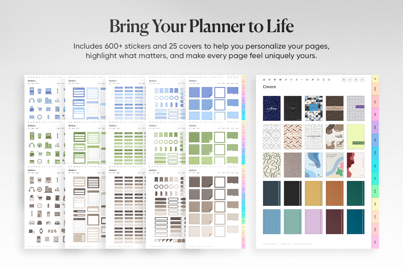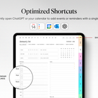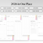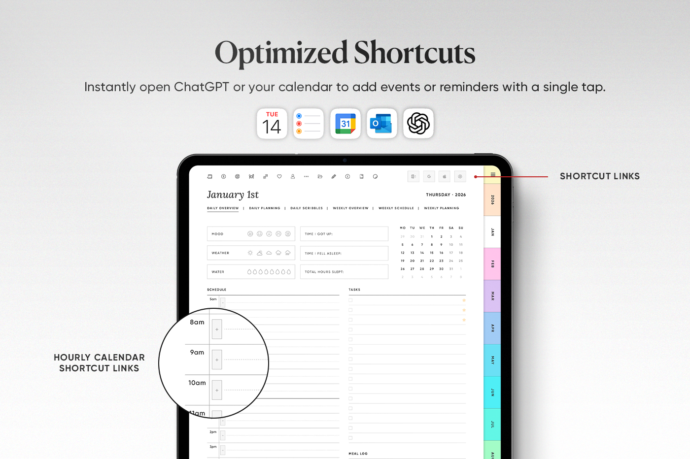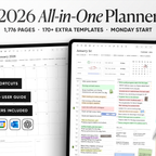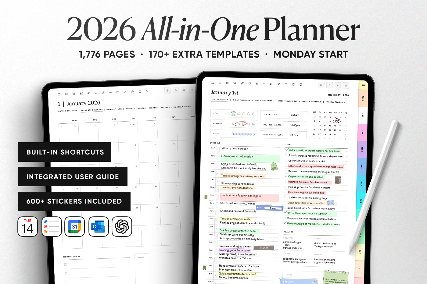The 2026 All-in-One Planner keeps your year organised in one place with daily, weekly, monthly, and yearly pages in multiple styles so you can plan your way. This planner is fully hyperlinked for fast navigation, includes 600+ stickers, and has built-in shortcuts for Apple Calendar, Google Calendar, Outlook, and ChatGPT. Clean, practical, and made to keep you consistent all year.