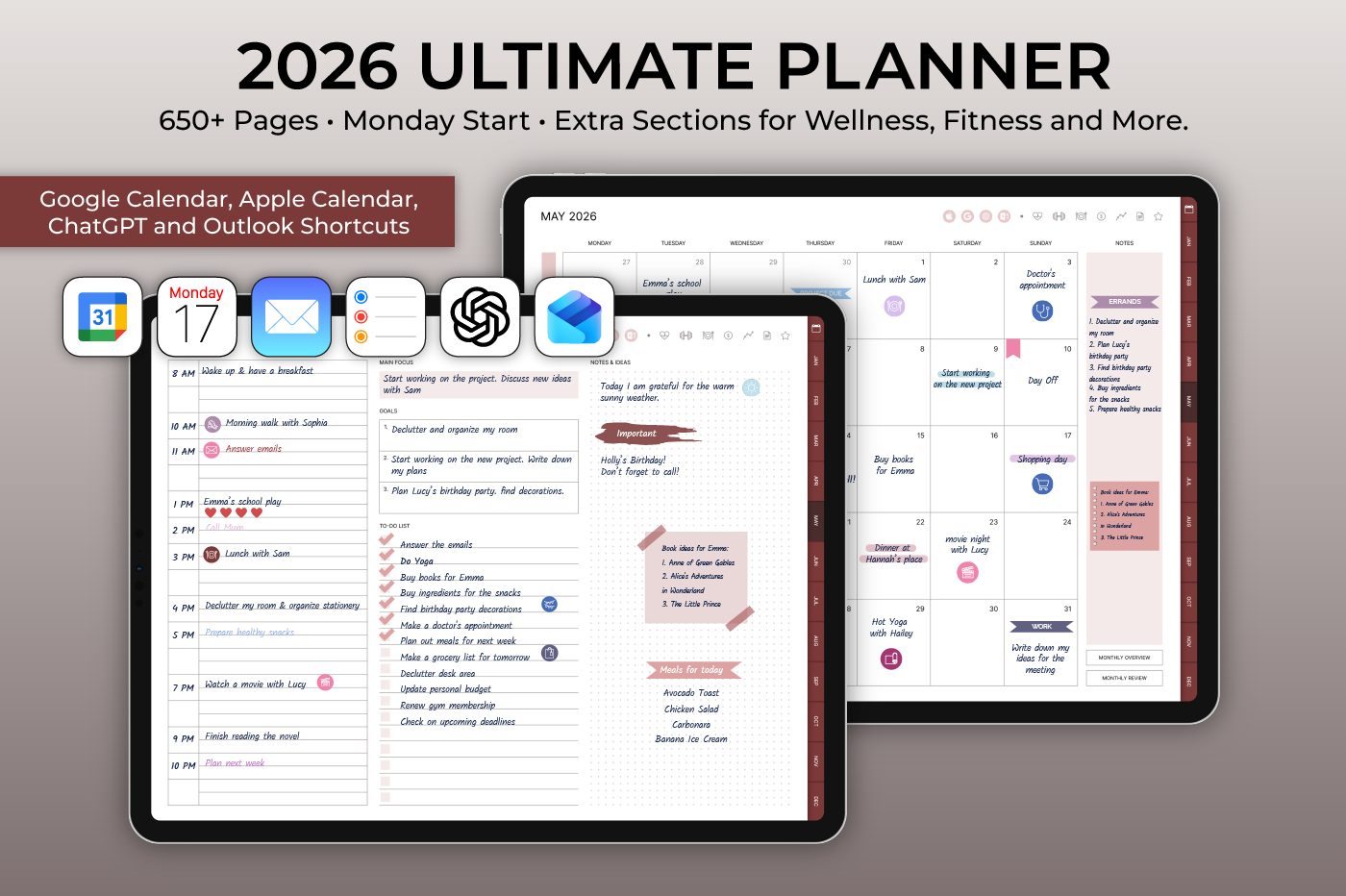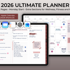 This 2026 Ultimate Planner is designed to help you organize every part of your life in one intuitive space. Plan your daily routines, track wellness and fitness, manage finances, and oversee projects all in one place. Stay motivated and productive throughout the year with sections built for personal growth and mindful living. Built-in links to Apple Calendar, Reminders, Apple Mail, Google Calendar, ChatGPT, and Outlook let you quickly add events, set reminders, and send emails from your planner.