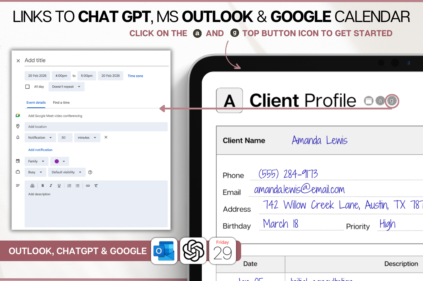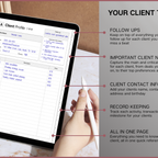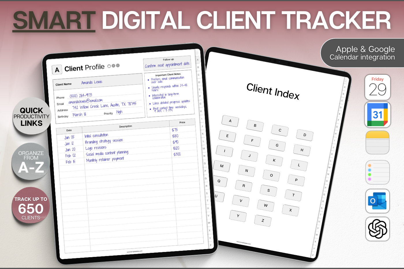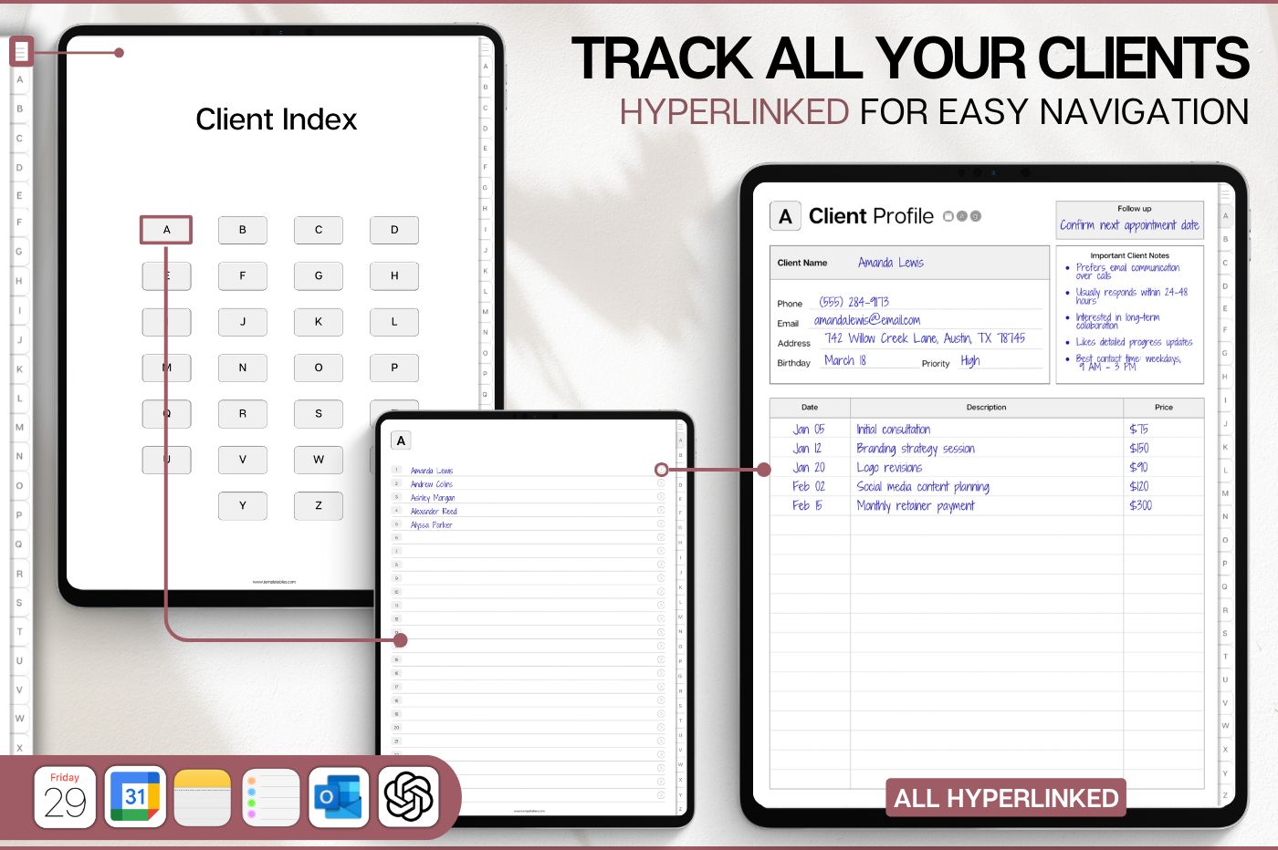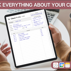 Stay on top of your clients with this powerful digital client tracker, designed for clarity and speed. Store contact details, notes, follow-ups, services and payments all on one linked system. Navigate instantly with A–Z tabs, track up to 650 clients, and jump straight to Apple Calendar, Google Calendar, Outlook or ChatGPT when you need it. Simple, structured and built for busy professionals