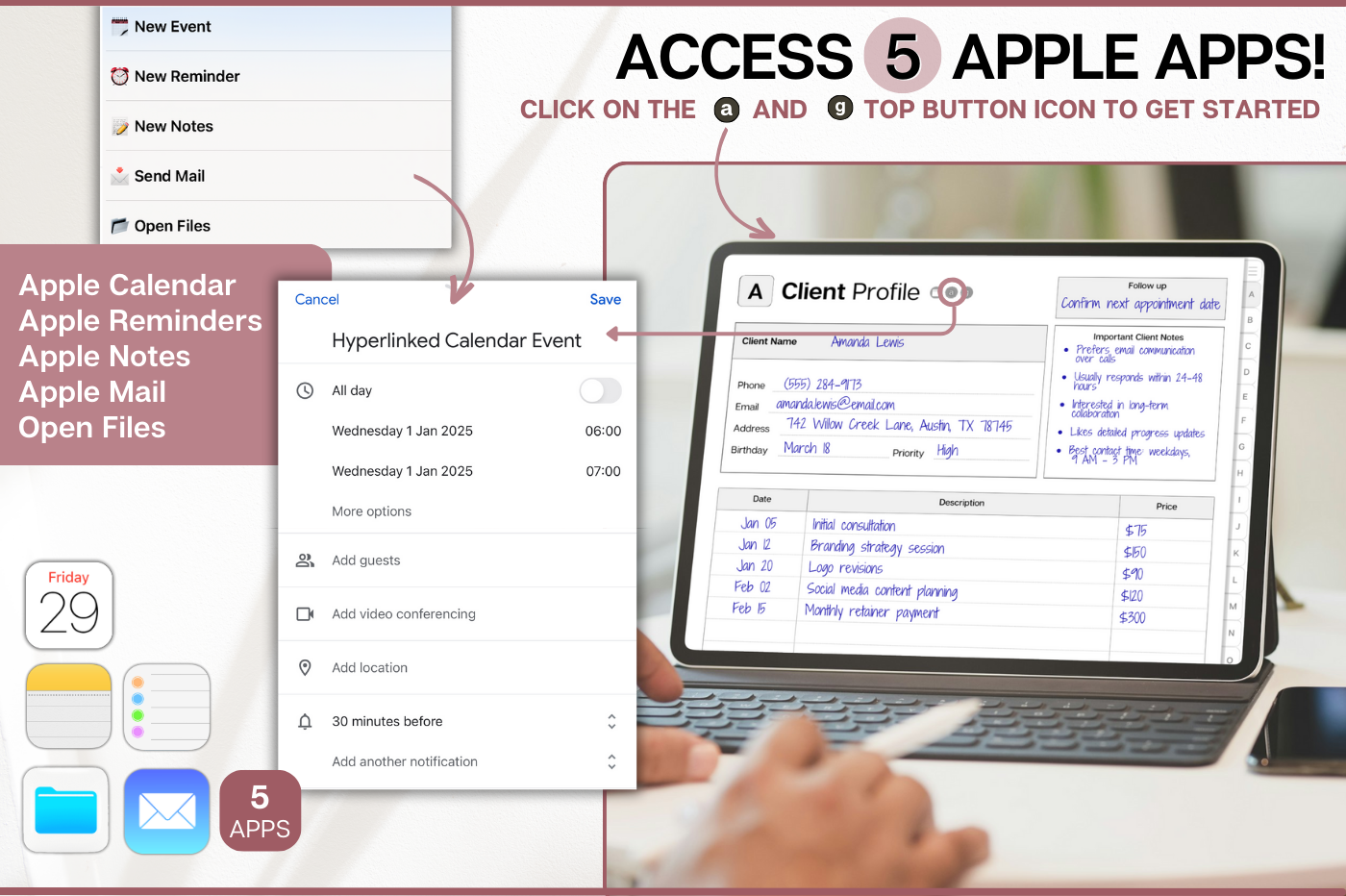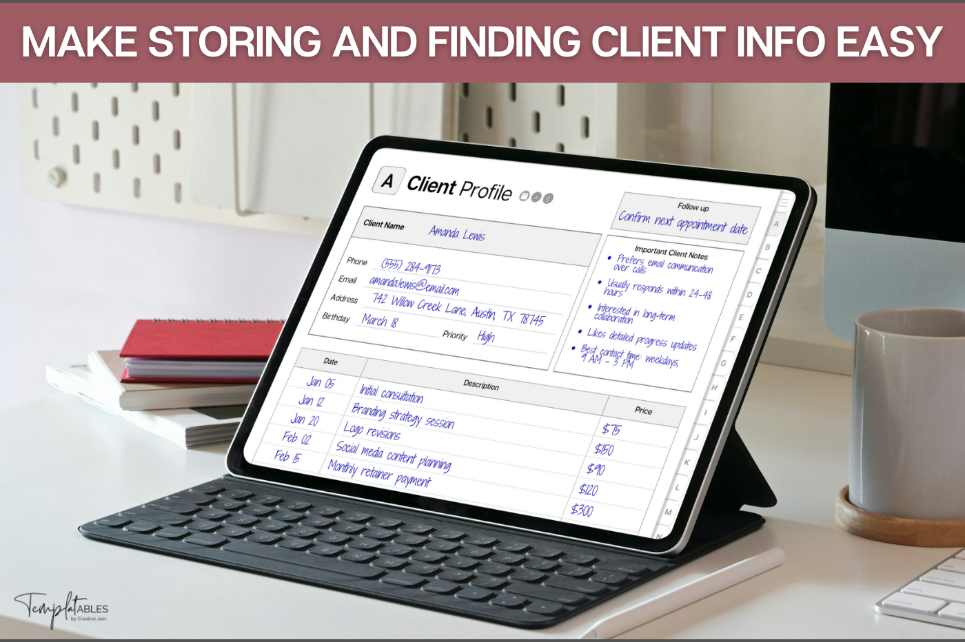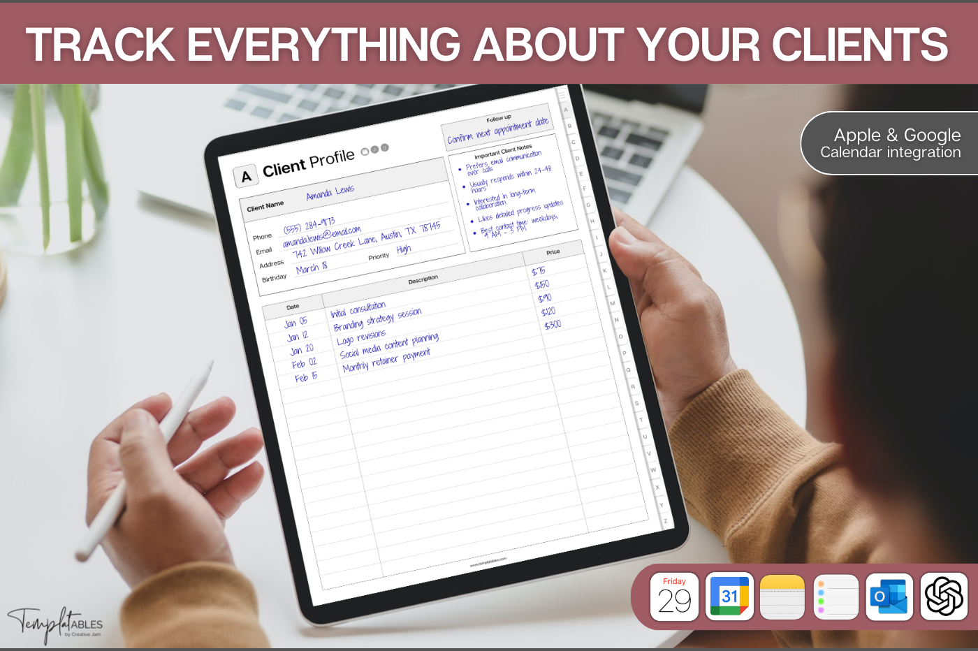 Stay on top of your clients with this powerful digital client tracker, designed for clarity and speed. Store contact details, notes, follow-ups, services and payments all on one linked system. Navigate instantly with A–Z tabs, track up to 650 clients, and jump straight to Apple Calendar, Google Calendar, Outlook or ChatGPT when you need it. Simple, structured and built for busy professionals