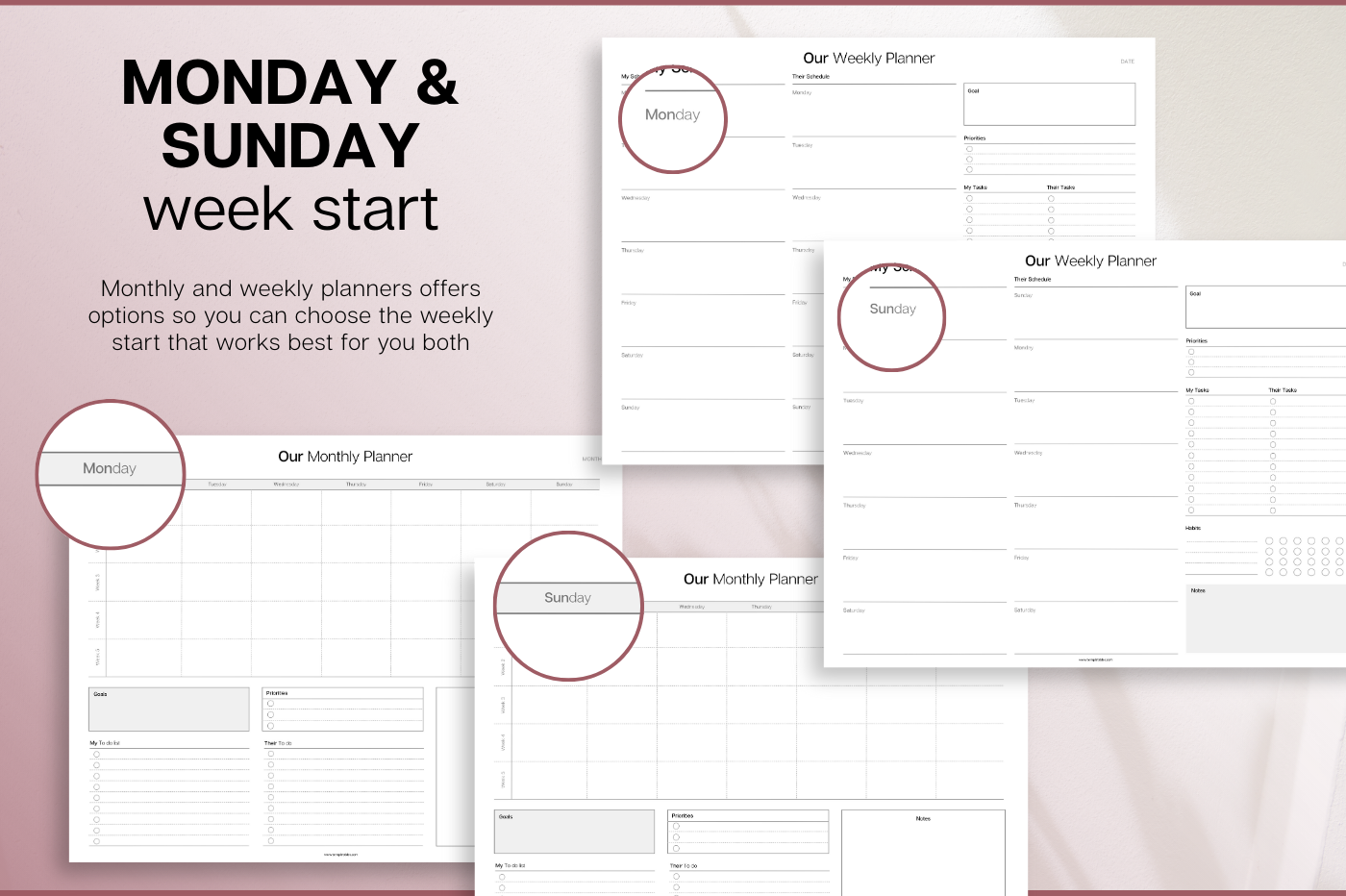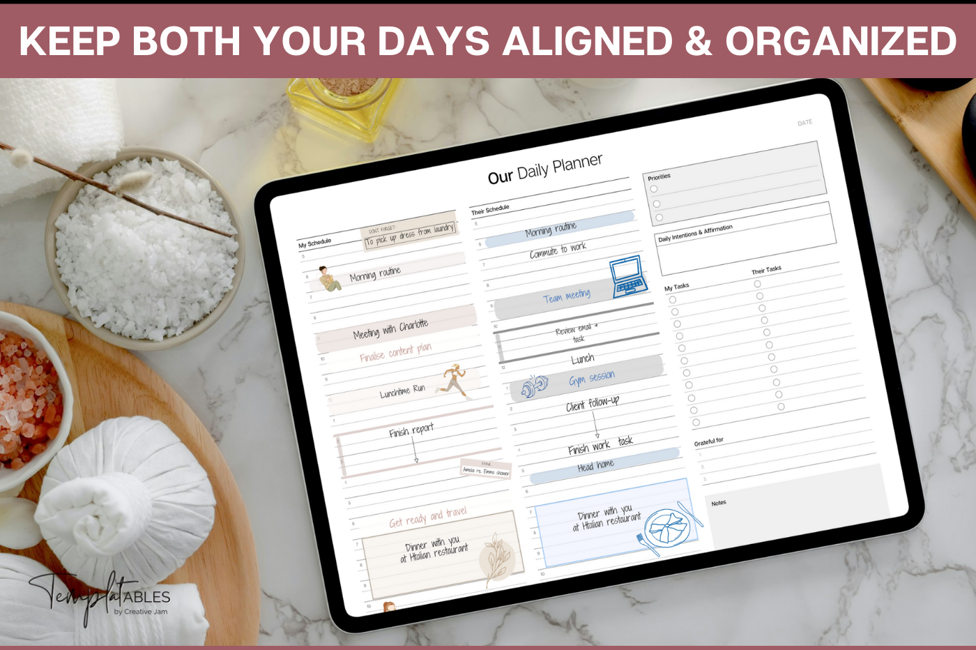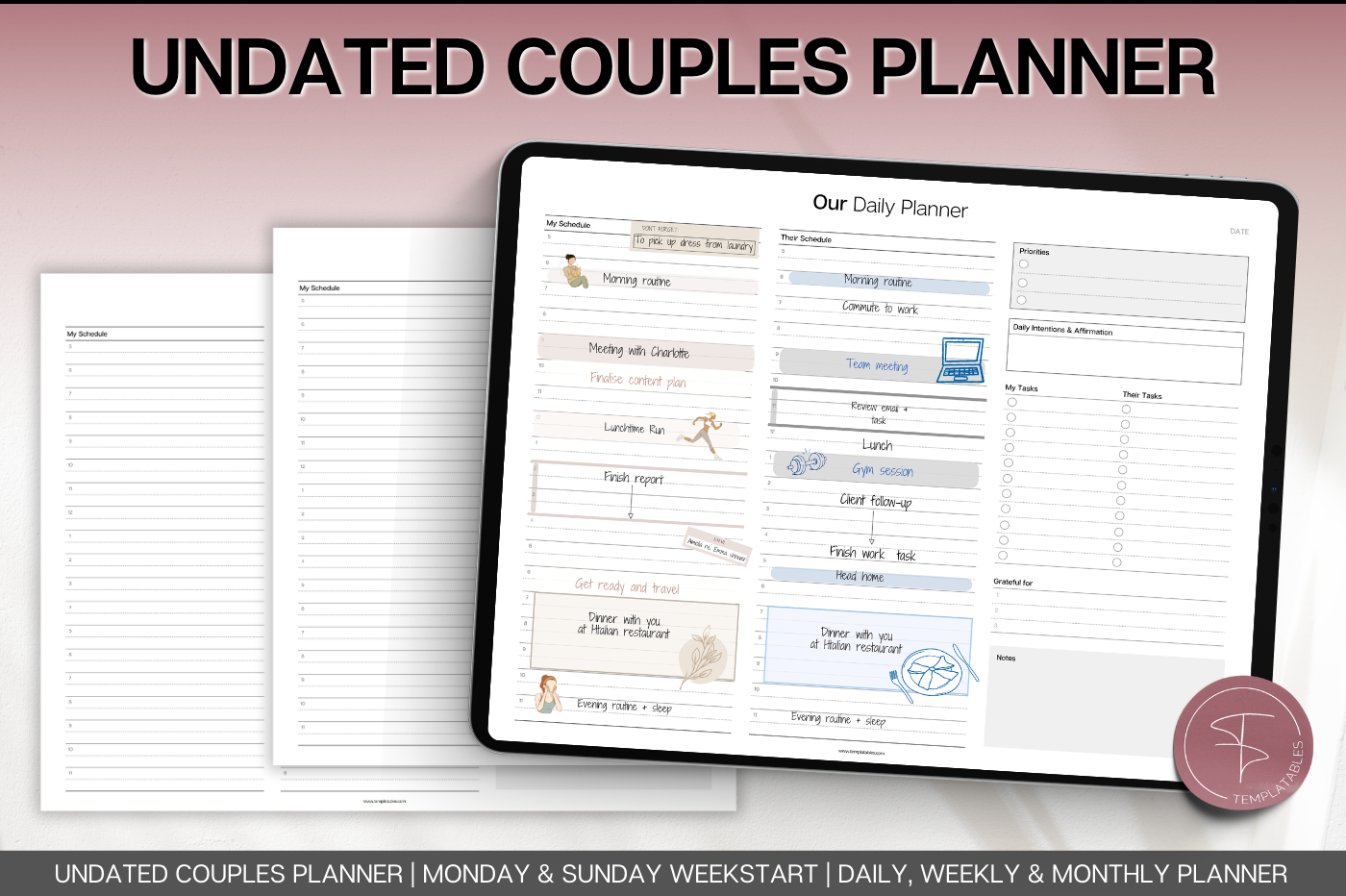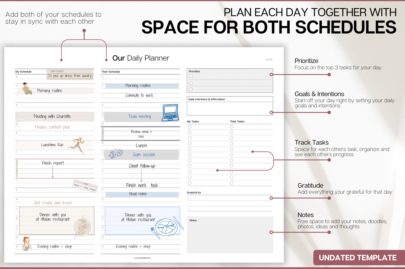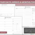 Designed for couples who want to stay organised together. This undated planning set lets you manage both schedules side-by-side, making it easy to align plans, share priorities and stay connected day to day. Includes daily, weekly and monthly layouts with space for both schedules, shared goals, tasks, gratitude and notes. With Monday & Sunday week starts, this flexible system works around your life and can be reused year after year. Plan smarter. Communicate better. Stay in sync