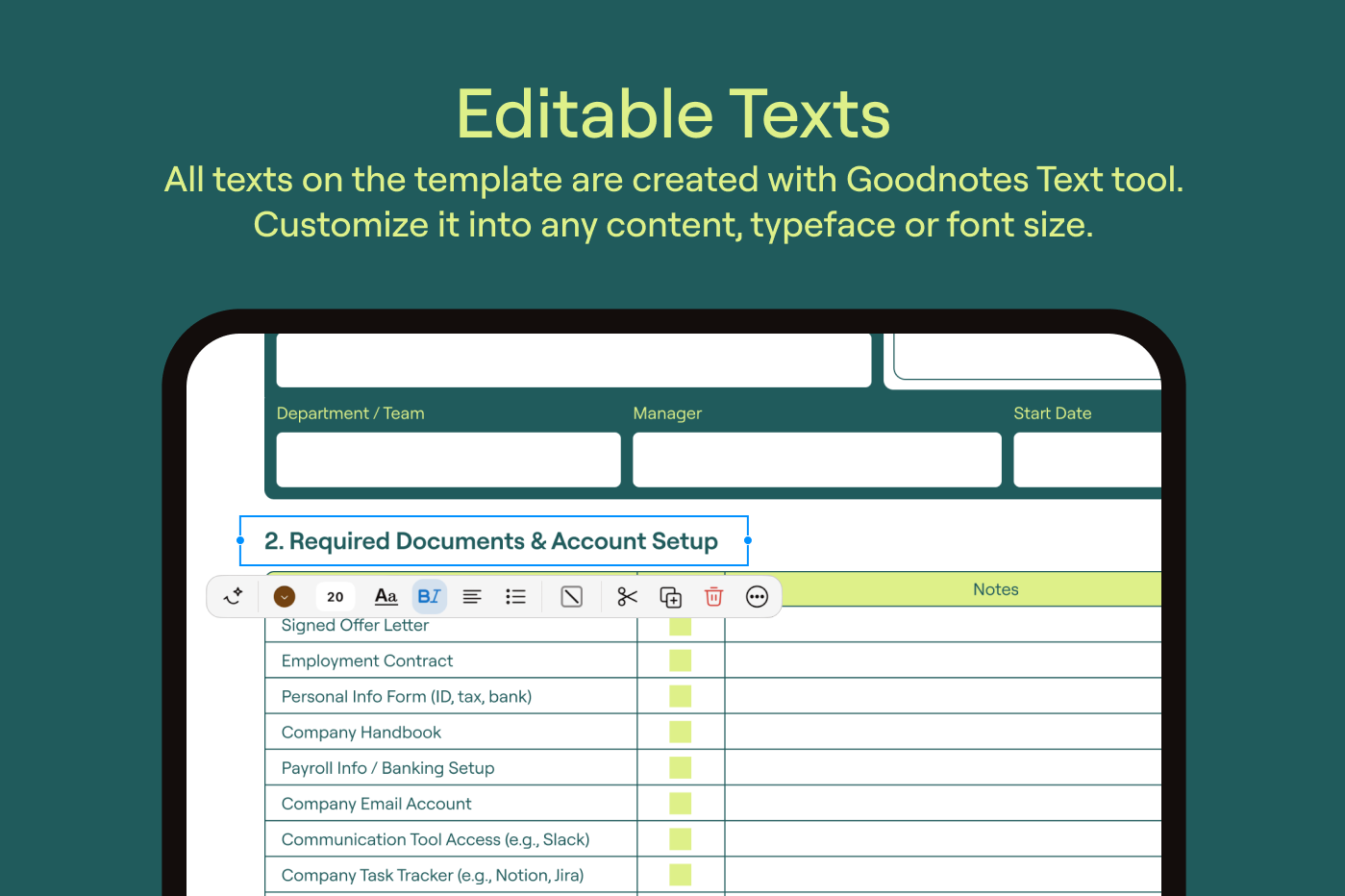 Track required documents,training sessions,and introductions. This checklist makes sure every new employee is set up for success from day one.