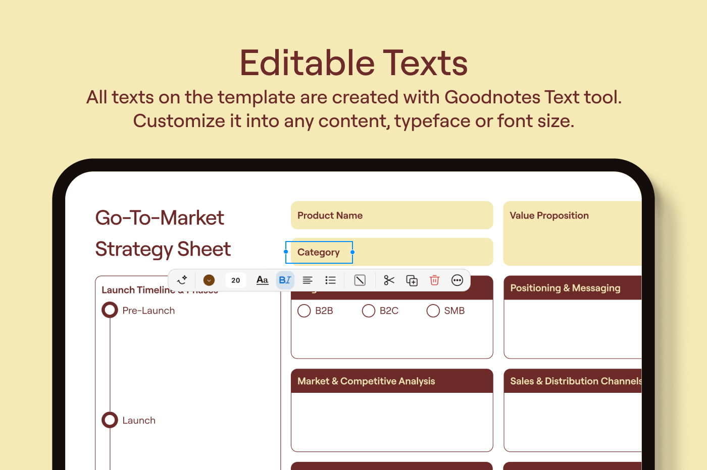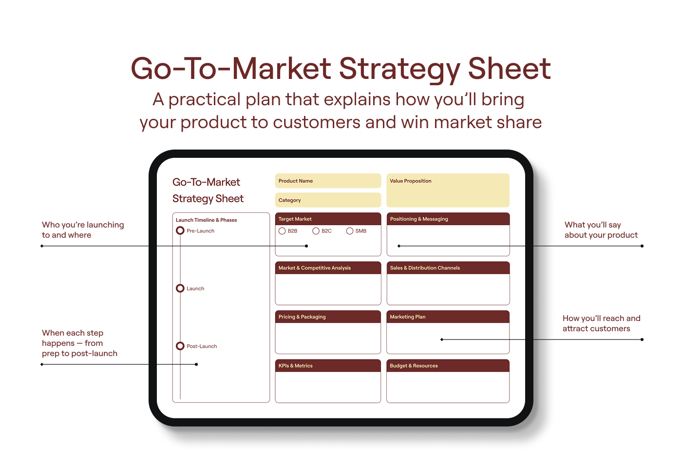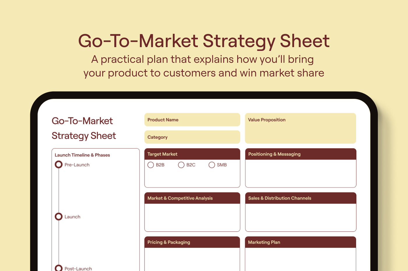 Map out your audience,key messages,and launch timeline in one place. This template helps you organize every step for a successful go-to-market strategy.