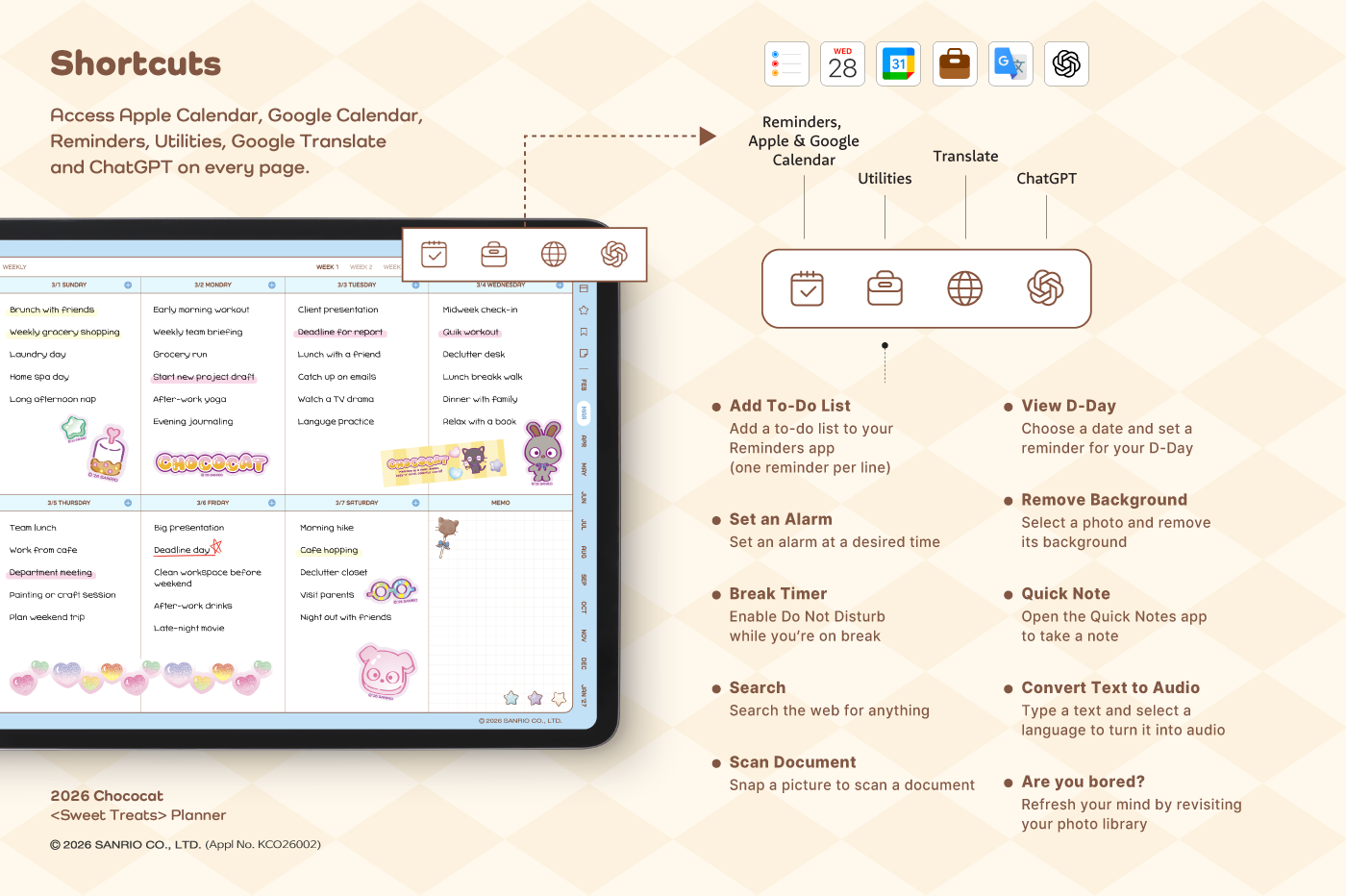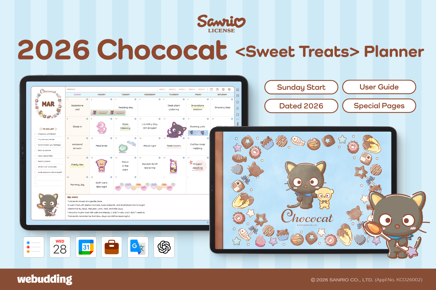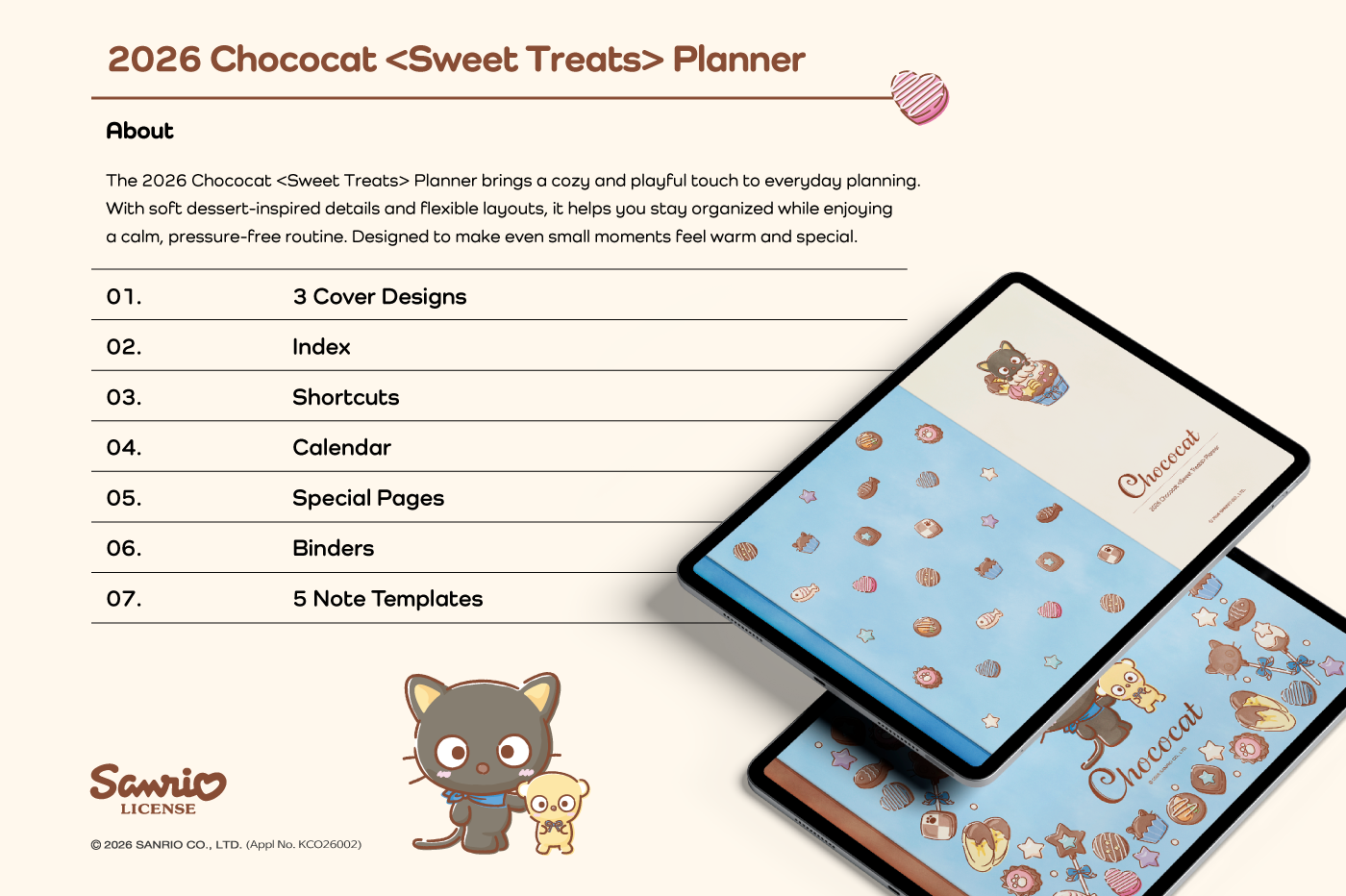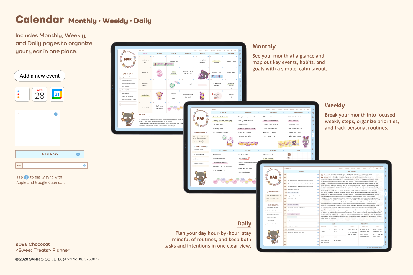 This product is for personal use only. Any unlawful use of the content may results in revoke of access. [Page Composition] - Apple & Google Calendar Integration (Apple devices only) - Sunday Start - Shortcuts Integrated (Calendar, Utilities, Translator, ChatGPT) - User Guide - Covers (3) - Index - Yearly (4 types) - Monthly / Weekly / Daily - Special Pages(10): Wishlist, Income & Expense Log, Meeting Notes, Review, Recipe, Travel, Photo Album, Scrapbook - Binders (5) - Notes (5 types) This product is permitted to a License agreement between Sanrio Korea Co., Ltd. and Webudding Inc., and unauthorized reproduction of this product and its characters is prohibited.