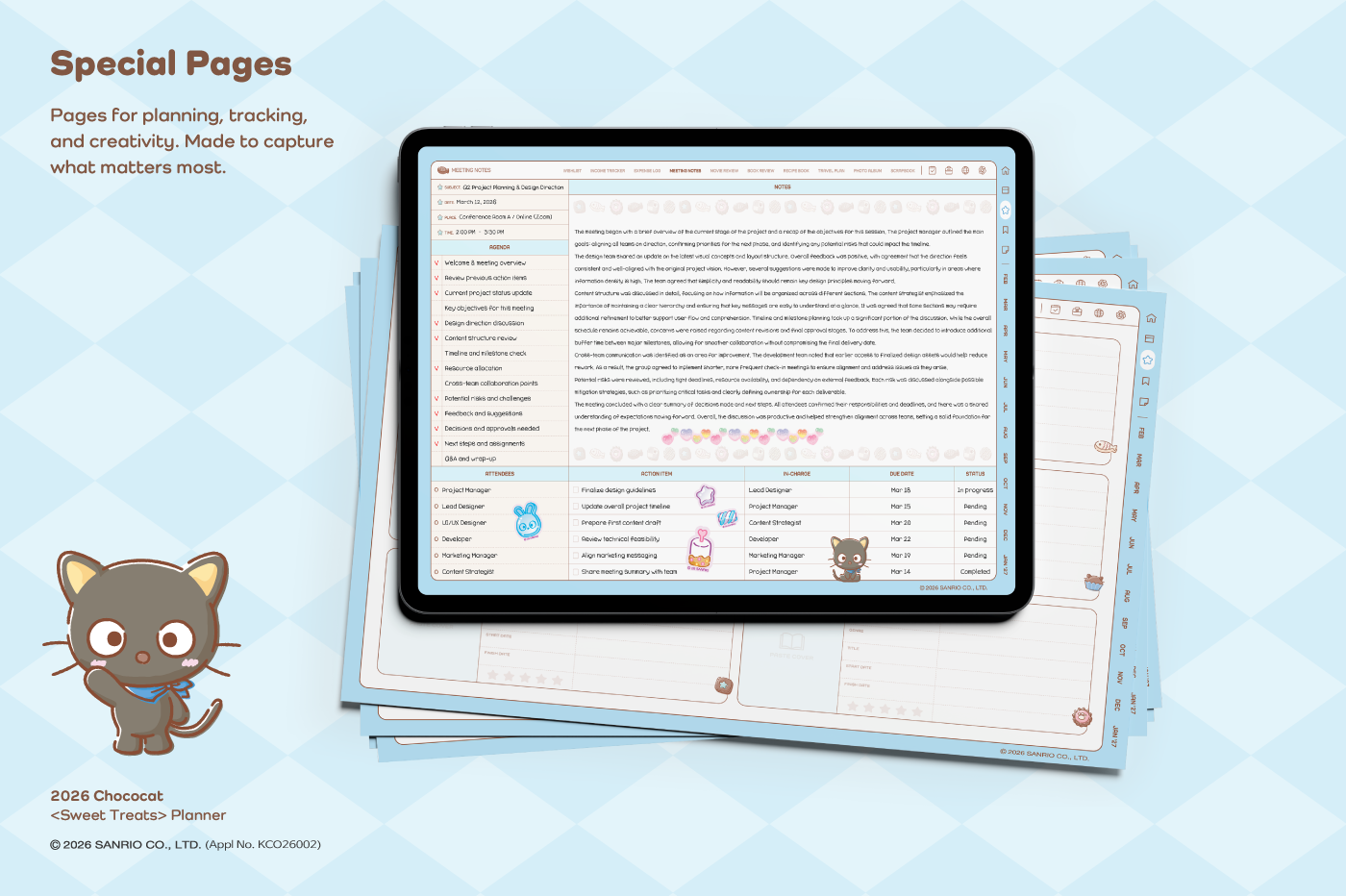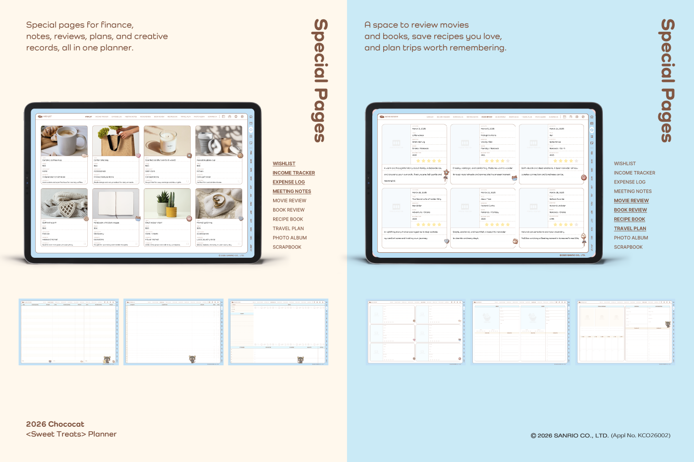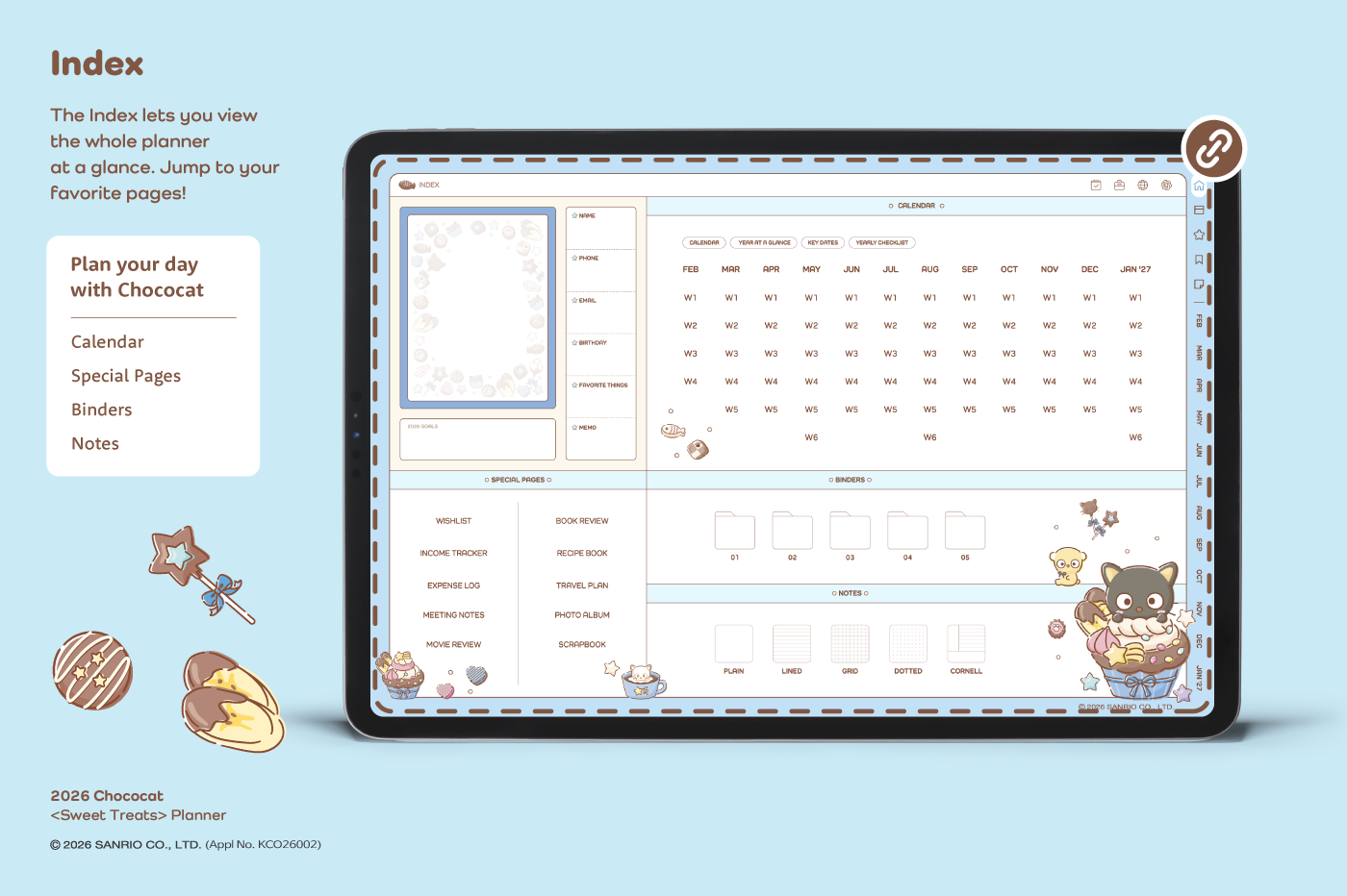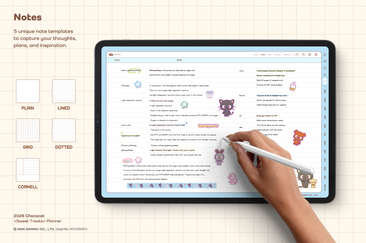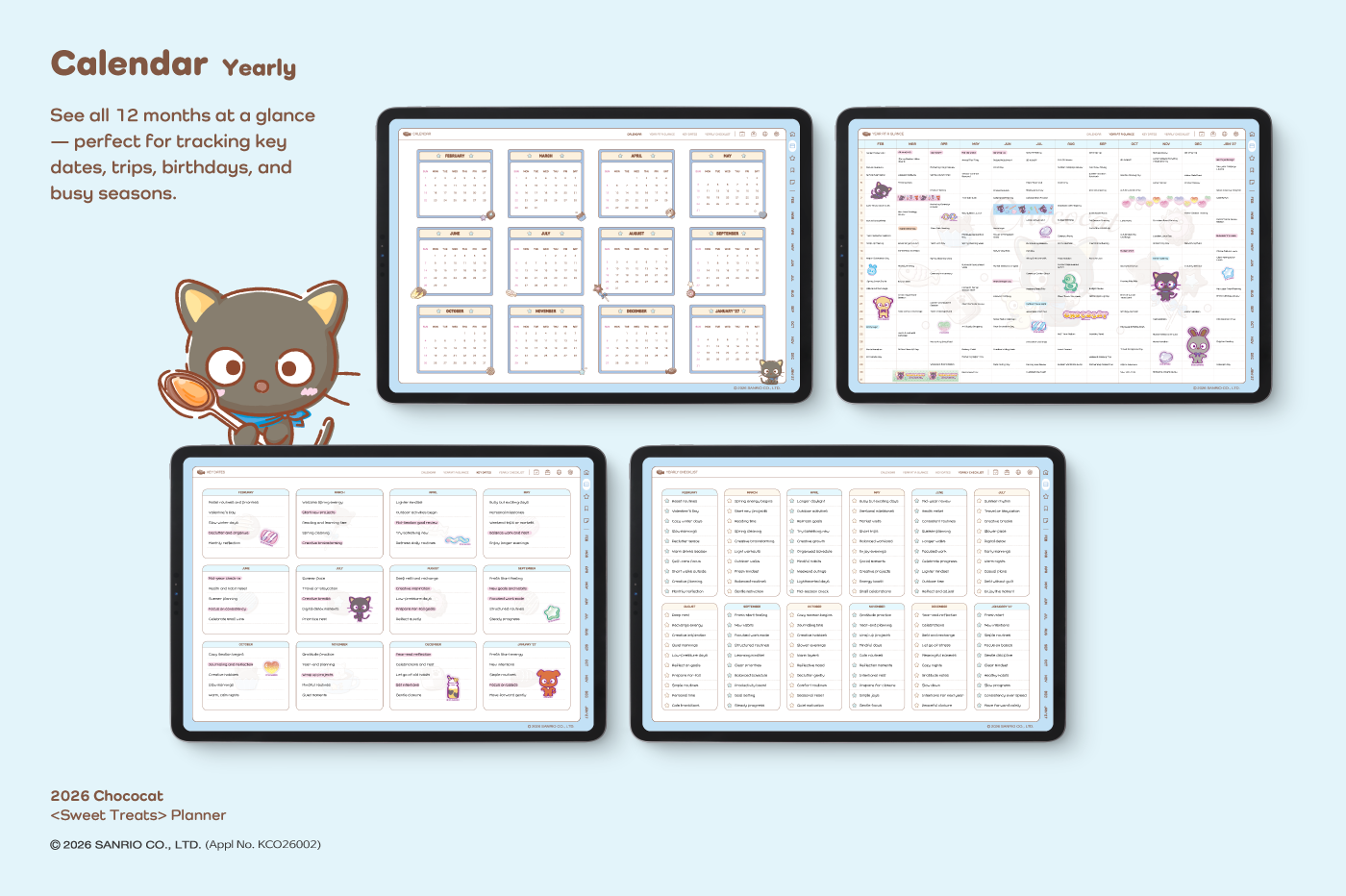 This product is for personal use only. Any unlawful use of the content may results in revoke of access. [Page Composition] - Apple & Google Calendar Integration (Apple devices only) - Sunday Start - Shortcuts Integrated (Calendar, Utilities, Translator, ChatGPT) - User Guide - Covers (3) - Index - Yearly (4 types) - Monthly / Weekly / Daily - Special Pages(10): Wishlist, Income & Expense Log, Meeting Notes, Review, Recipe, Travel, Photo Album, Scrapbook - Binders (5) - Notes (5 types) This product is permitted to a License agreement between Sanrio Korea Co., Ltd. and Webudding Inc., and unauthorized reproduction of this product and its characters is prohibited.
