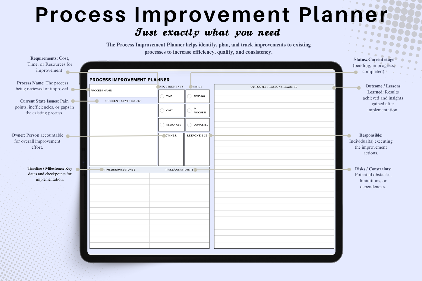 A structured page for identifying inefficiencies and planning targeted improvements
