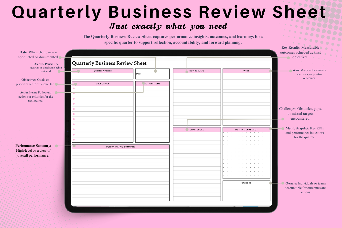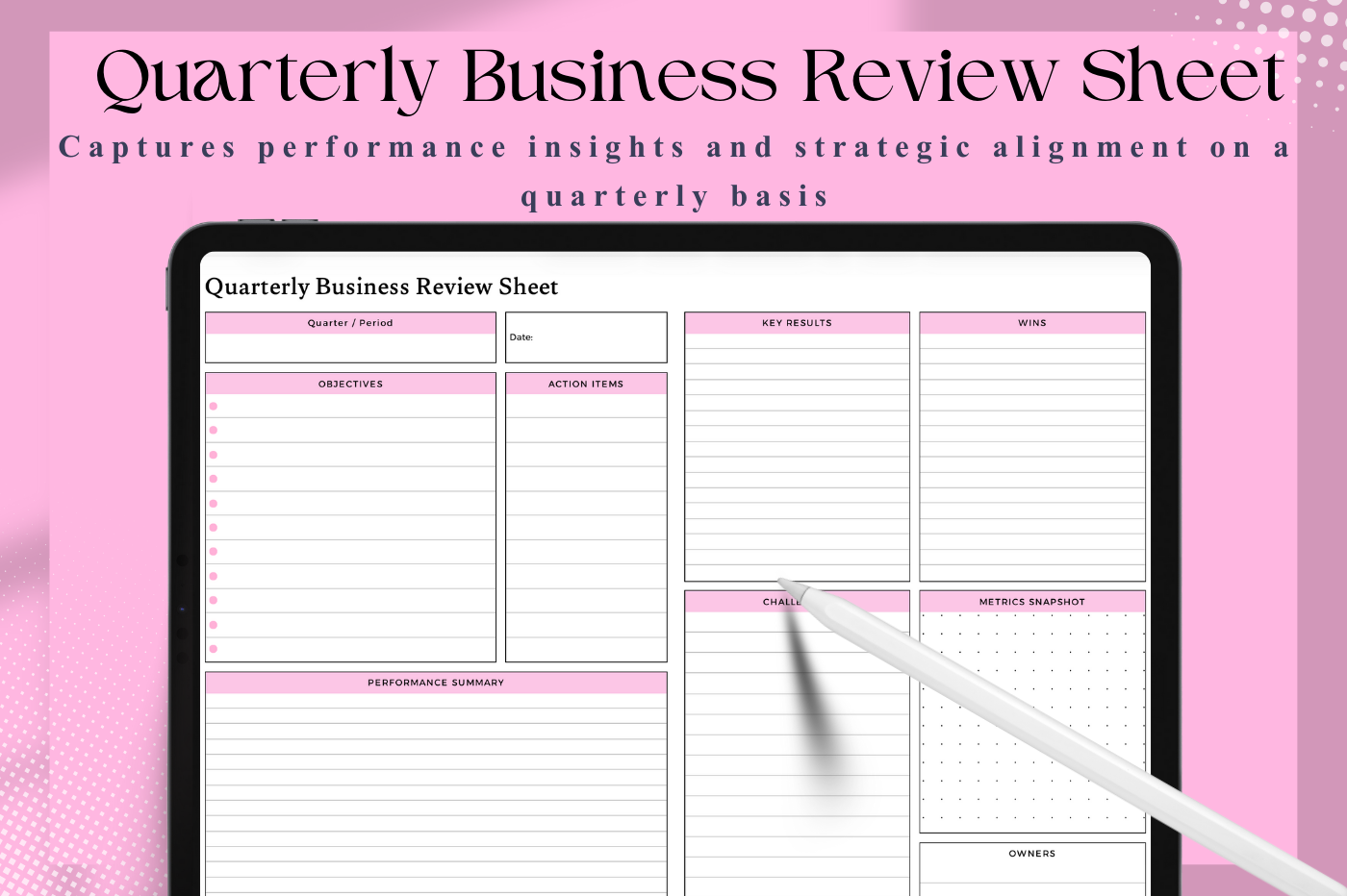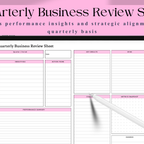 A structured page for summarizing performance,outcomes,and action items per quarter.