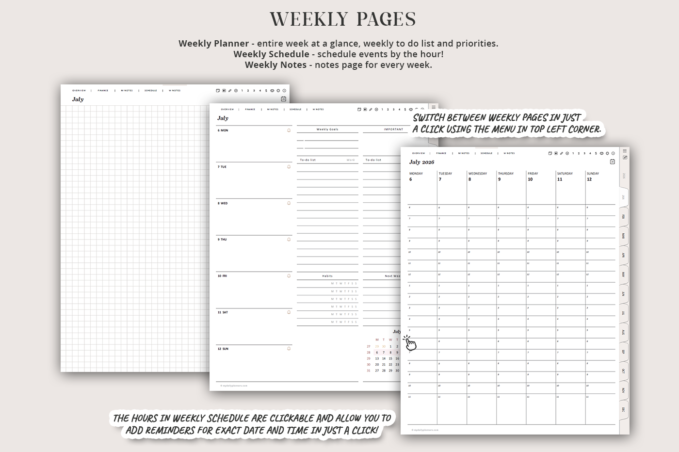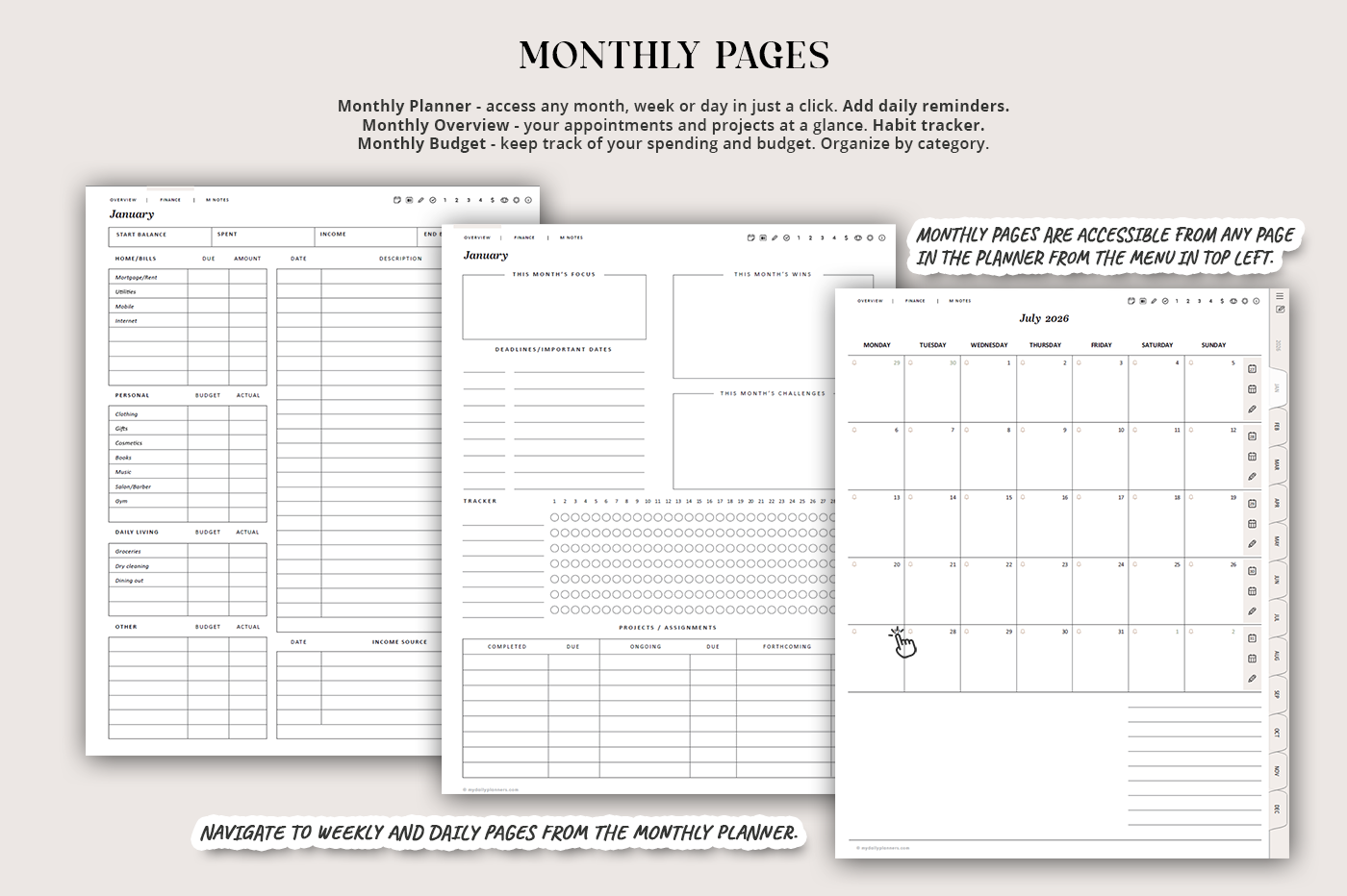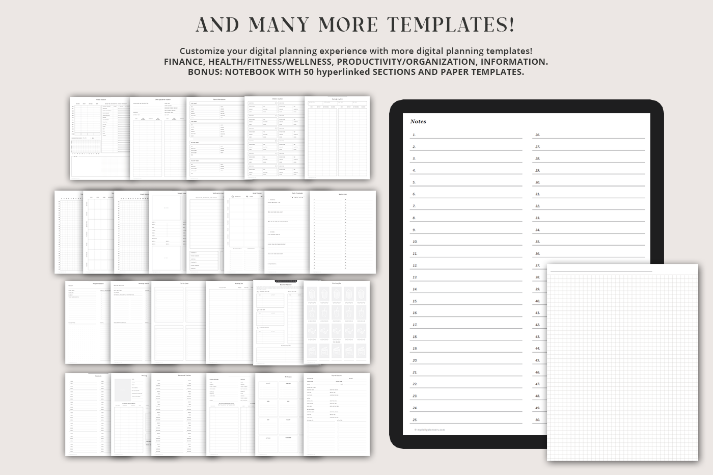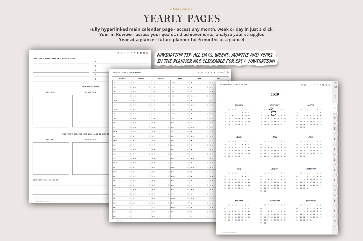 Stay organized with this all-in-one digital planner featuring yearly, monthly, weekly, and daily pages connected by over 100,000 hyperlinks for seamless navigation. Includes dedicated sections for finance tracking, meal planning, project management, goal setting, to-do lists, mood tracking, gratitude, reflection, and more—everything you need to manage your life in one place.