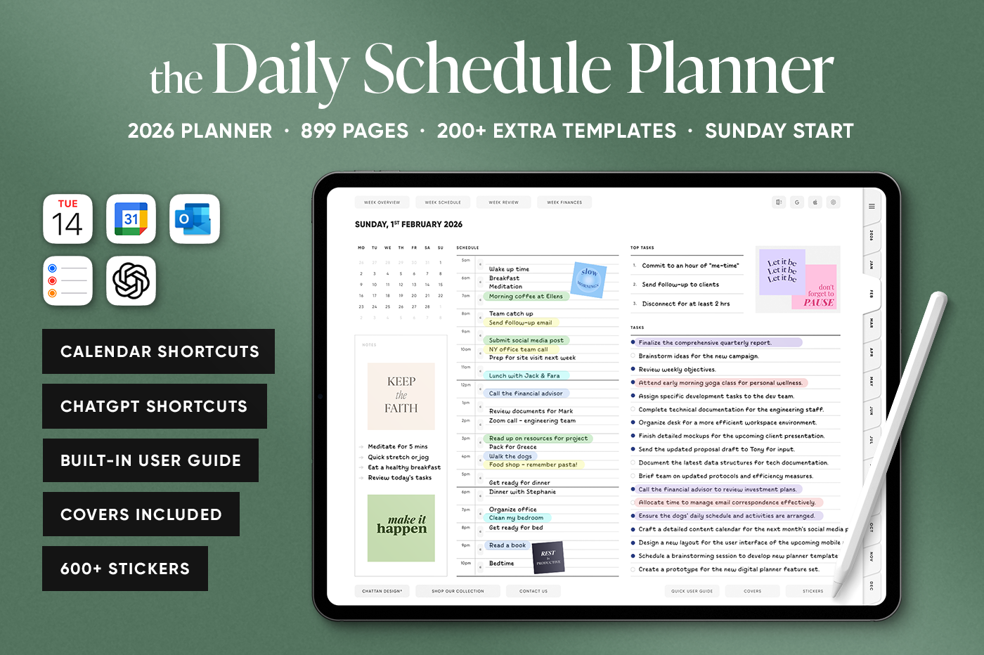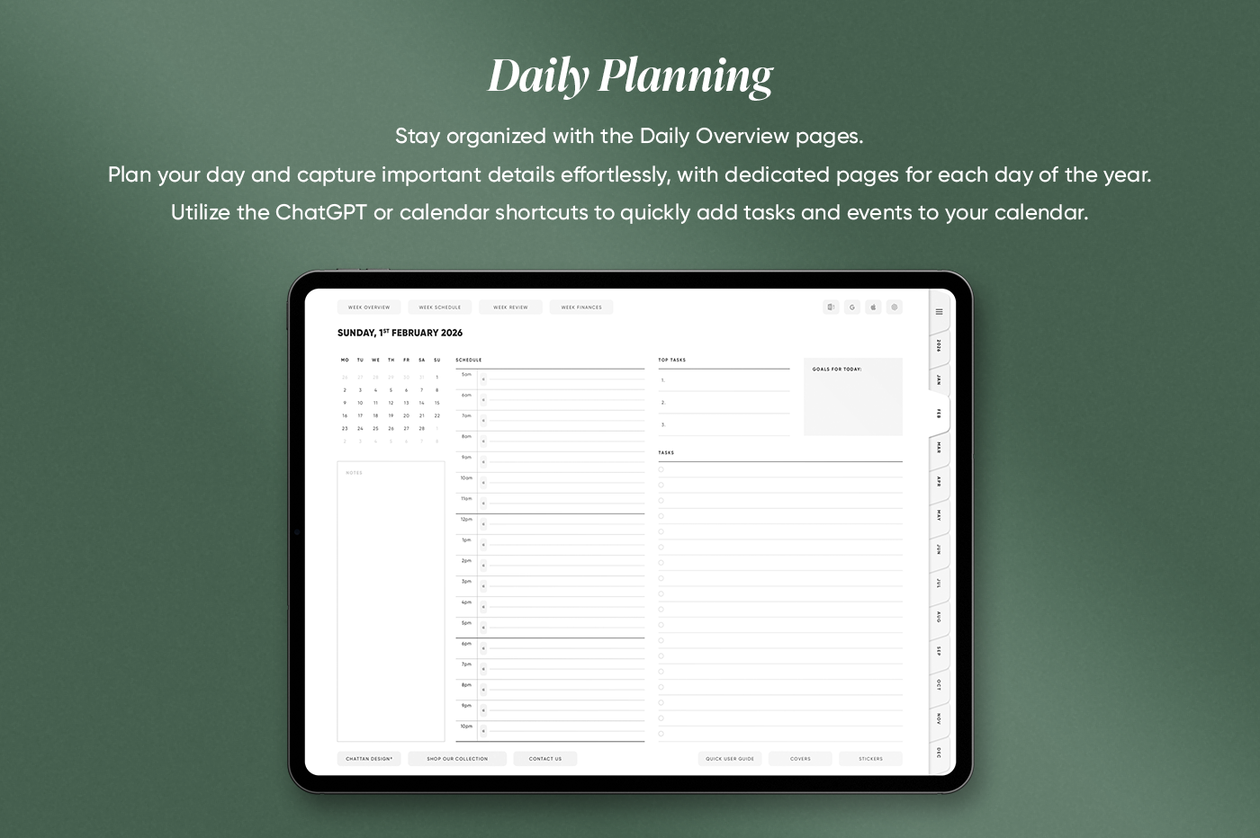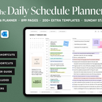 The Daily Schedule Planner is made for people who want structure without a cluttered layout. It brings daily, weekly, and monthly planning into one clean, easy system, so you always know what’s coming up and what needs done next. Alongside the core planner pages, this planner includes extra templates for goals, habits, fitness, wellness, and finances, keeping everything in one place instead of spread across separate documents. The built-in calendar and ChatGPT shortcuts let you add events and reminders quickly as you plan, so staying organised feels simple, not time-consuming.