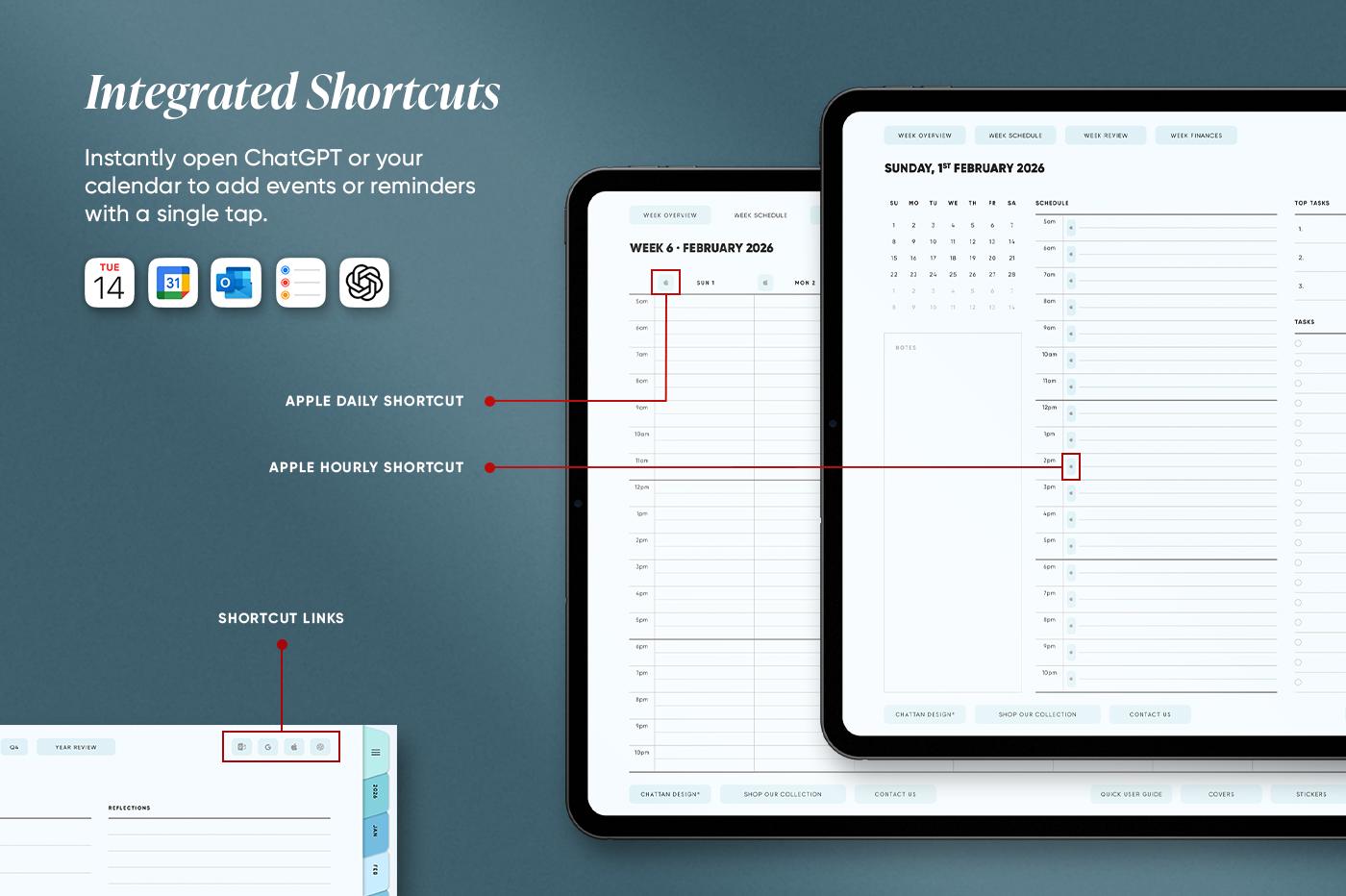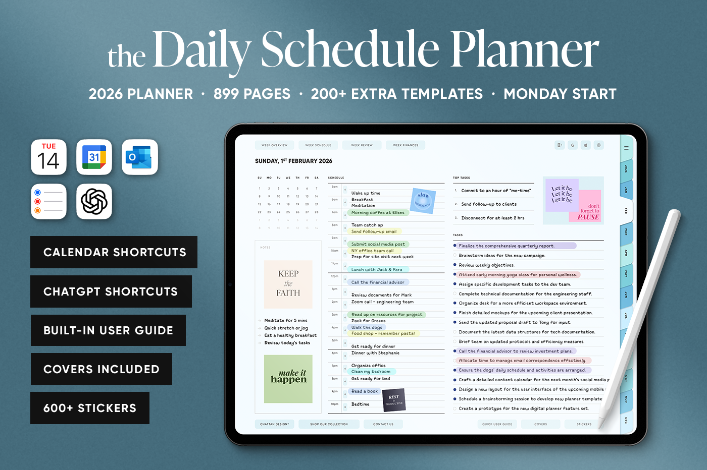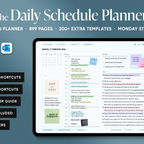 The Daily Schedule Planner is made for people who want structure without a cluttered layout. It brings daily, weekly, and monthly planning into one clean, easy system, so you always know what’s coming up and what needs done next. Alongside the core planner pages, this planner includes extra templates for goals, habits, fitness, wellness, and finances, keeping everything in one place instead of spread across separate documents. The built-in calendar and ChatGPT shortcuts let you add events and reminders quickly as you plan, so staying organised feels simple, not time-consuming.