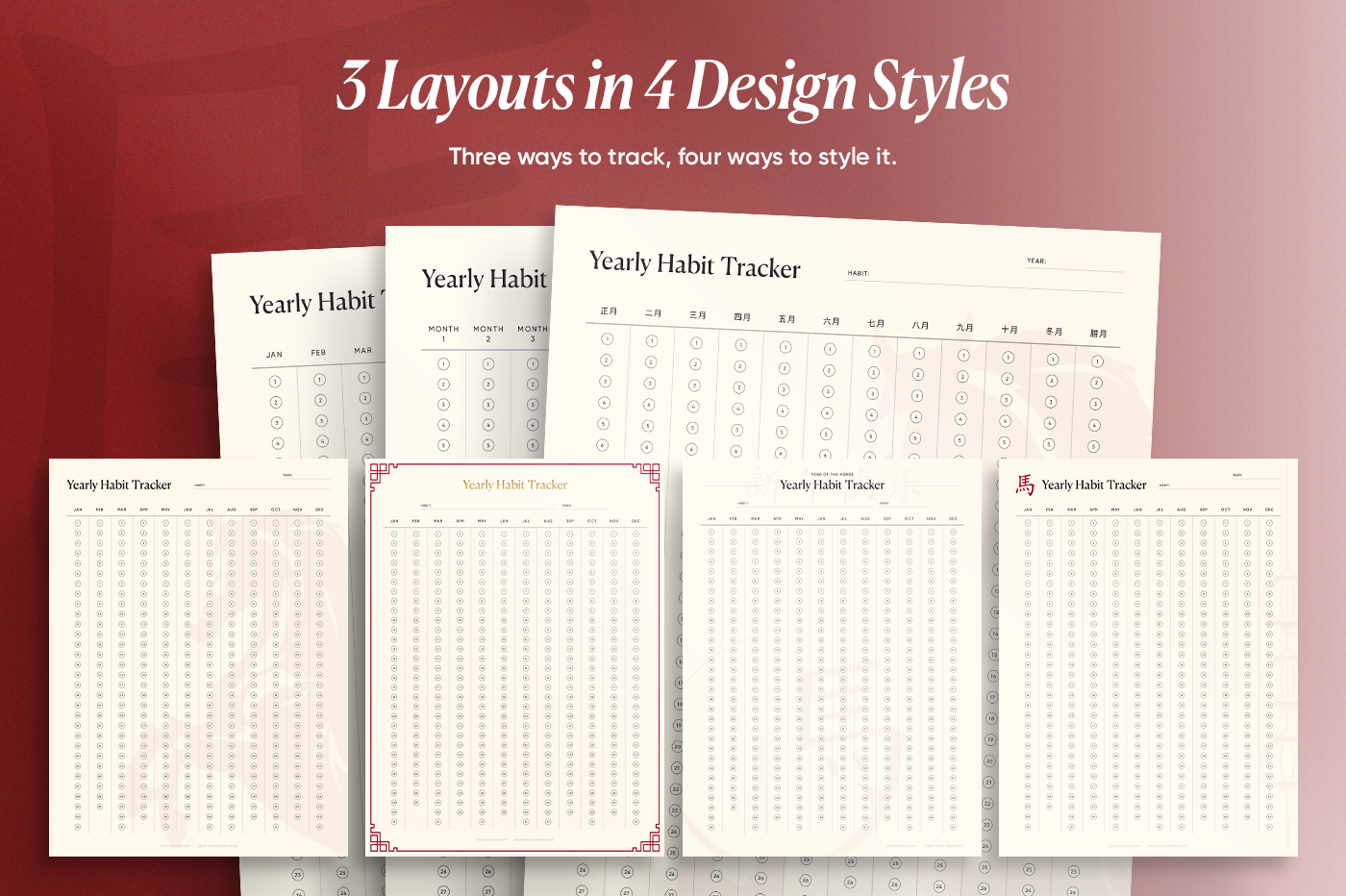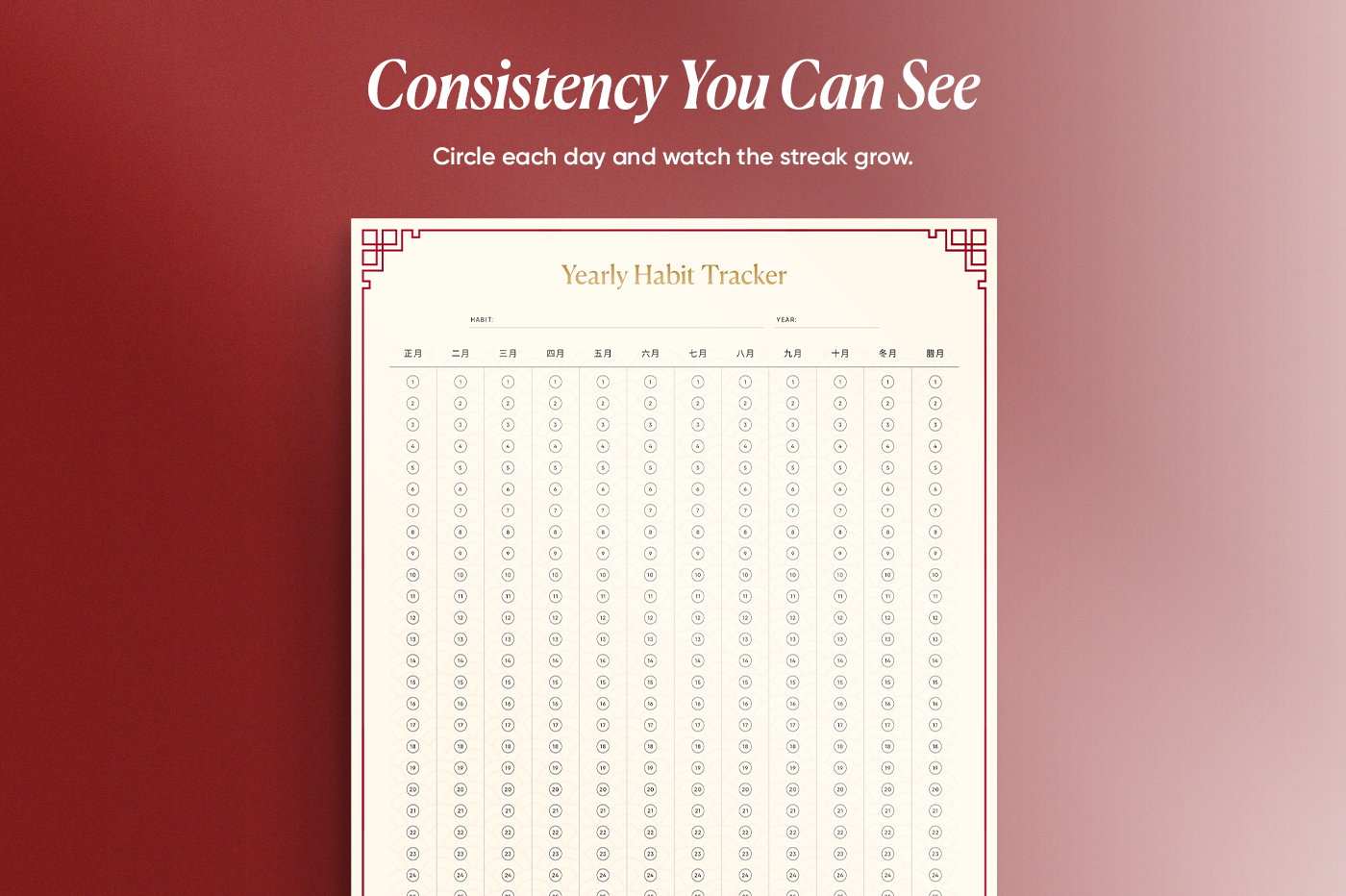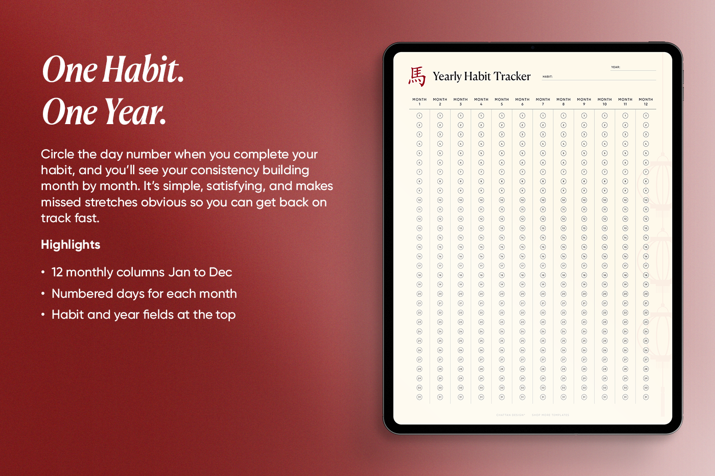 A big-picture habit tracker for the full year. Great for anyone who wants to stay consistent long-term and quickly see how their habit is trending across the months.