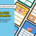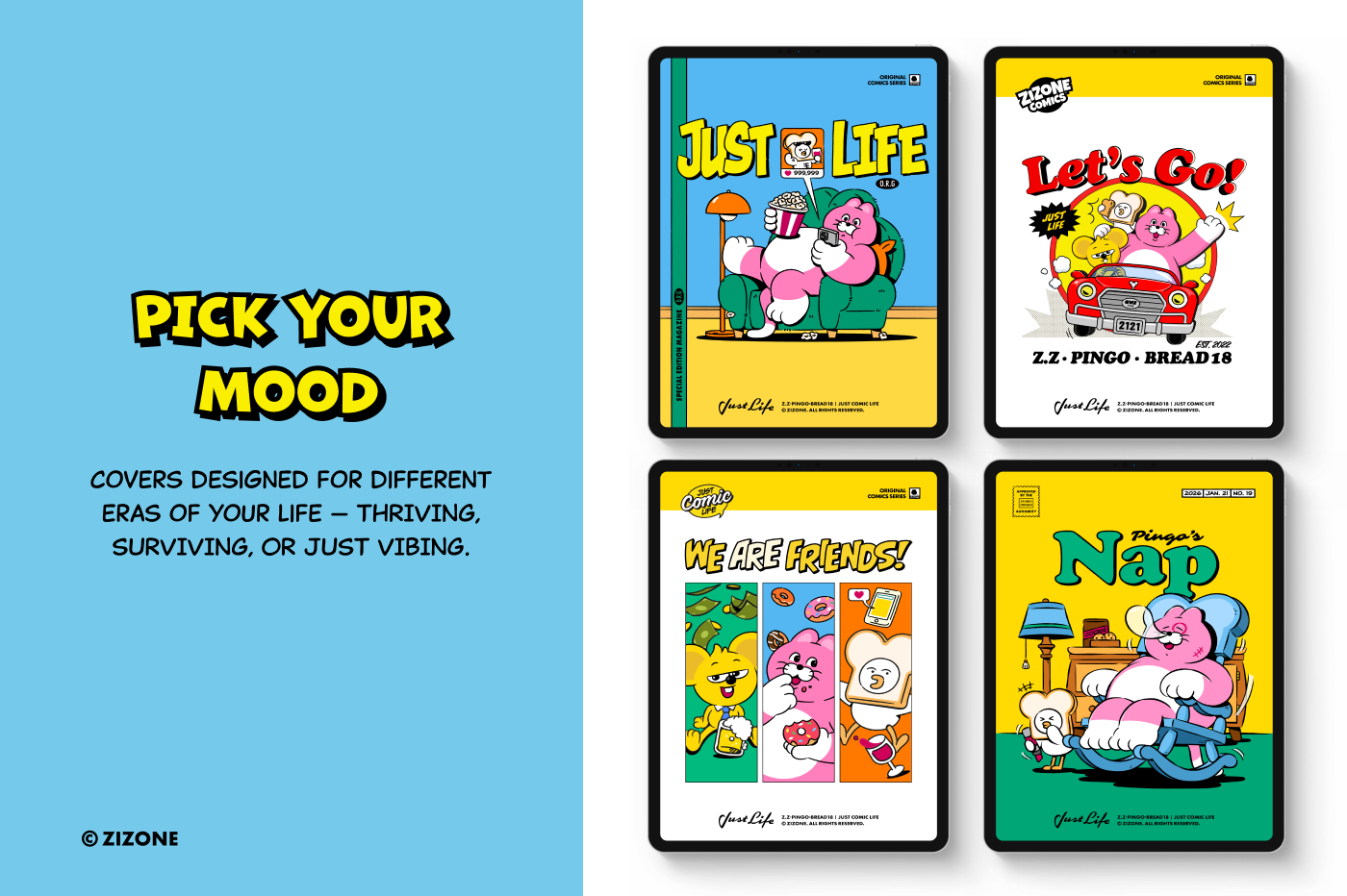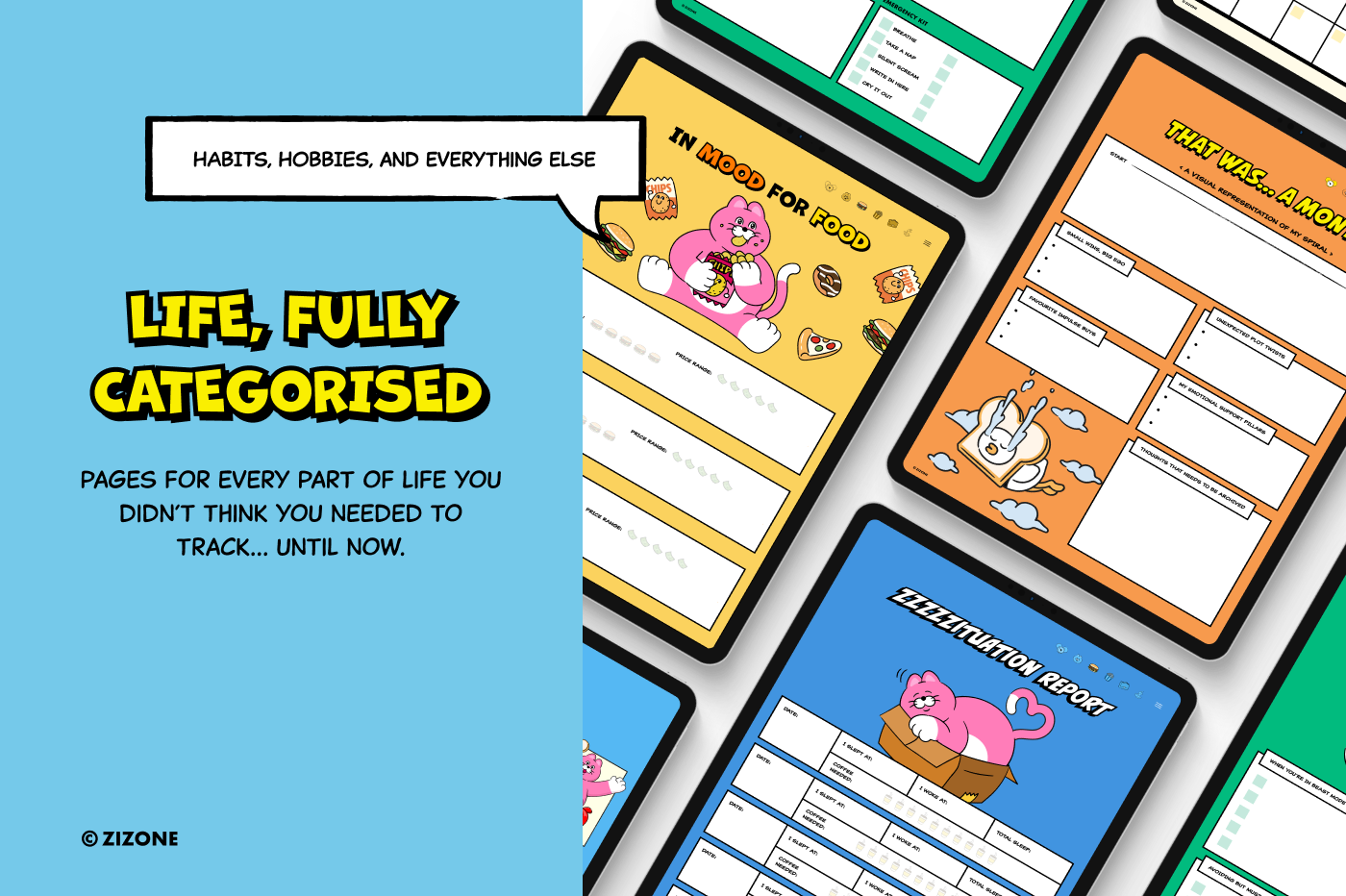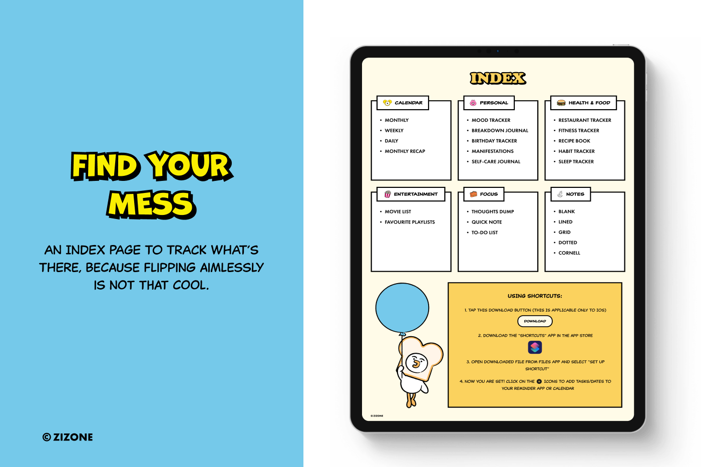 The beloved characters from the Korean illustration series "ZIZONE" - pink cat PINGO, big-eared mouse Z.Z, and toast bird BREAD18, inviting everyone to explore their American comic style world through the new digital planner! [Page Composition] - Undated Planner, Monday Start - Covers (4) and ZIZONE themed pages (4) - Calendar (monthly, weekly, daily, etc.) - Personal (mood tracker, self-care journal, etc.) - Health & Food (restaurant tracker, recipe book, etc.) - Entertainment (movie list, etc.) - Focus (thoughts dump, to-do list, etc.) - Notes (5 types)
