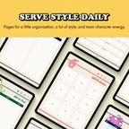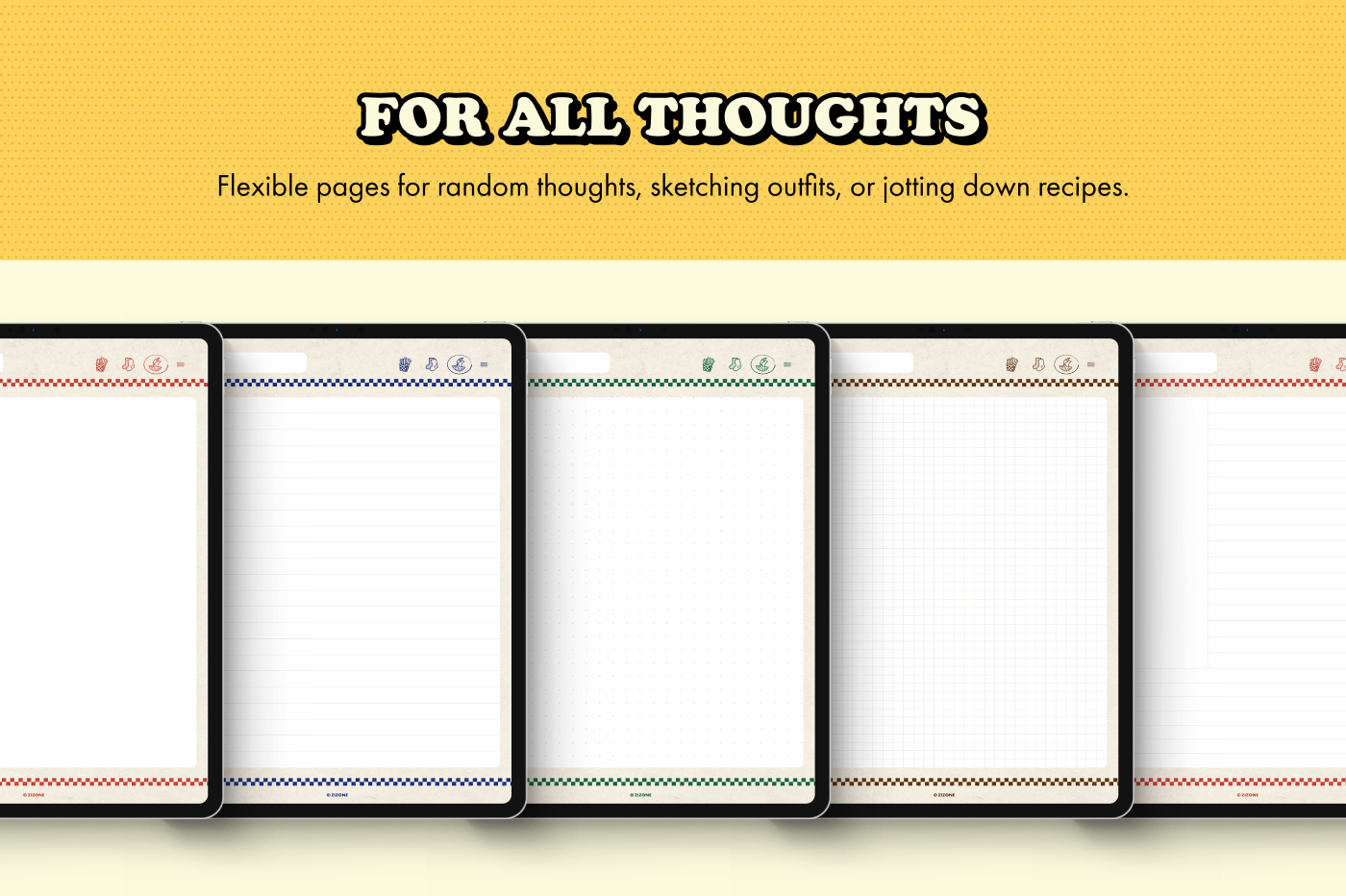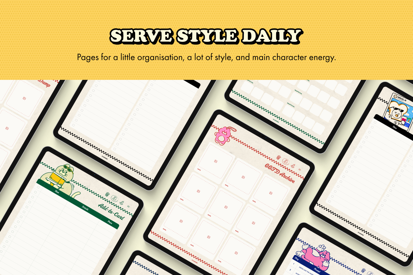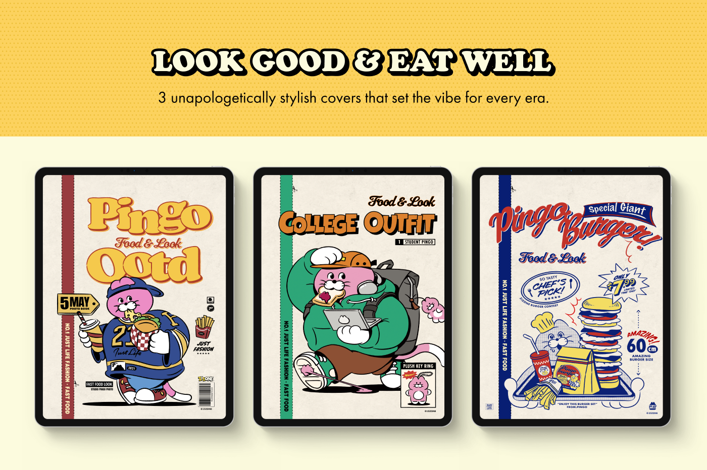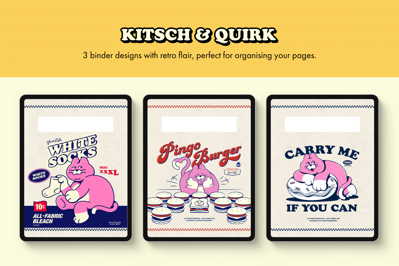 The beloved characters from the Korean illustration series "ZIZONE" - pink cat PINGO, big-eared mouse Z.Z, and toast bird BREAD18, inviting everyone to explore their American comic style world through the new digital notebook about Food & Look! Suitable for school, work, personal journaling, or project planning. [Page Composition] - ZIZONE HOUSE-themed Covers (3) - Binders (3) - Template-based layout with fun visual cues (19 templates - all about Food, Fashion, Notes [such as Lined, Dot Grid, Grid, Blank, etc.]) This product is for personal use only. Any unlawful use of the content may results in revoke of access.