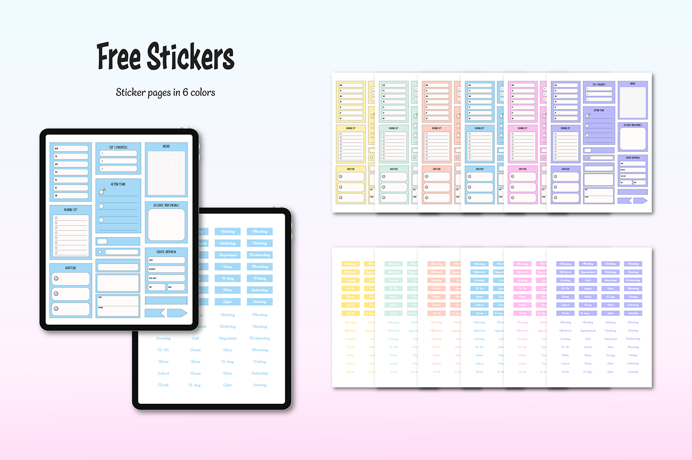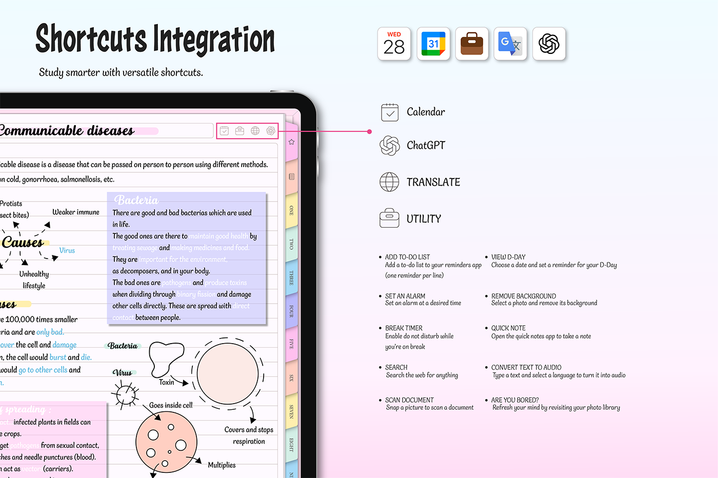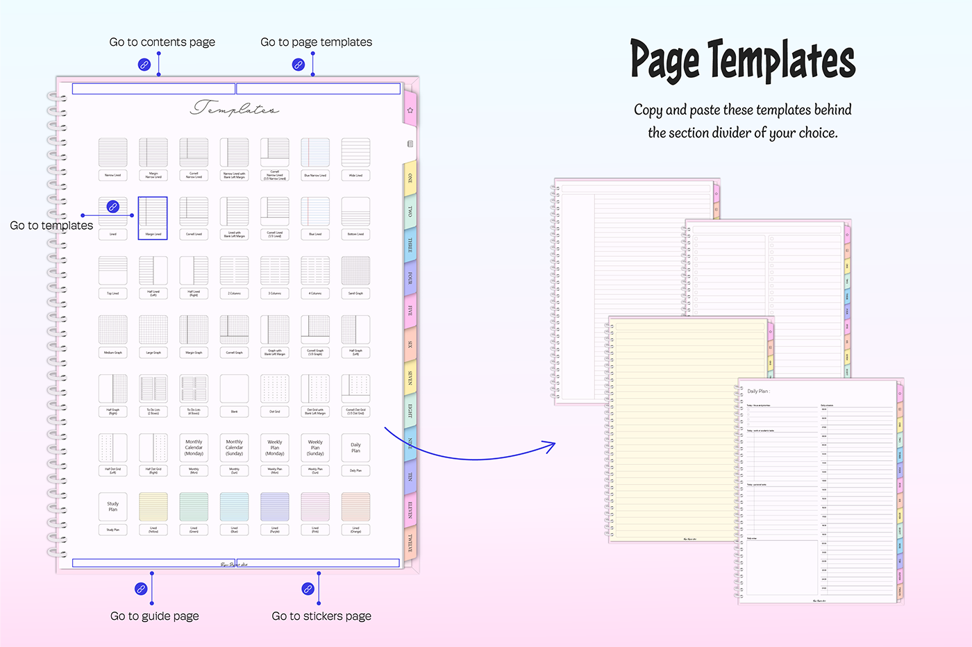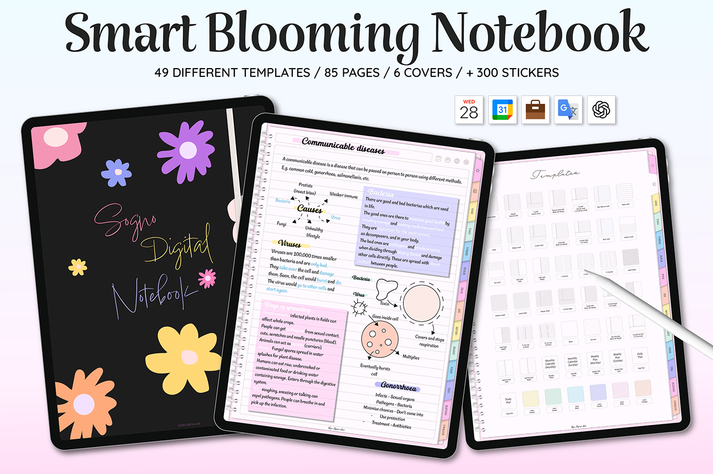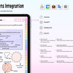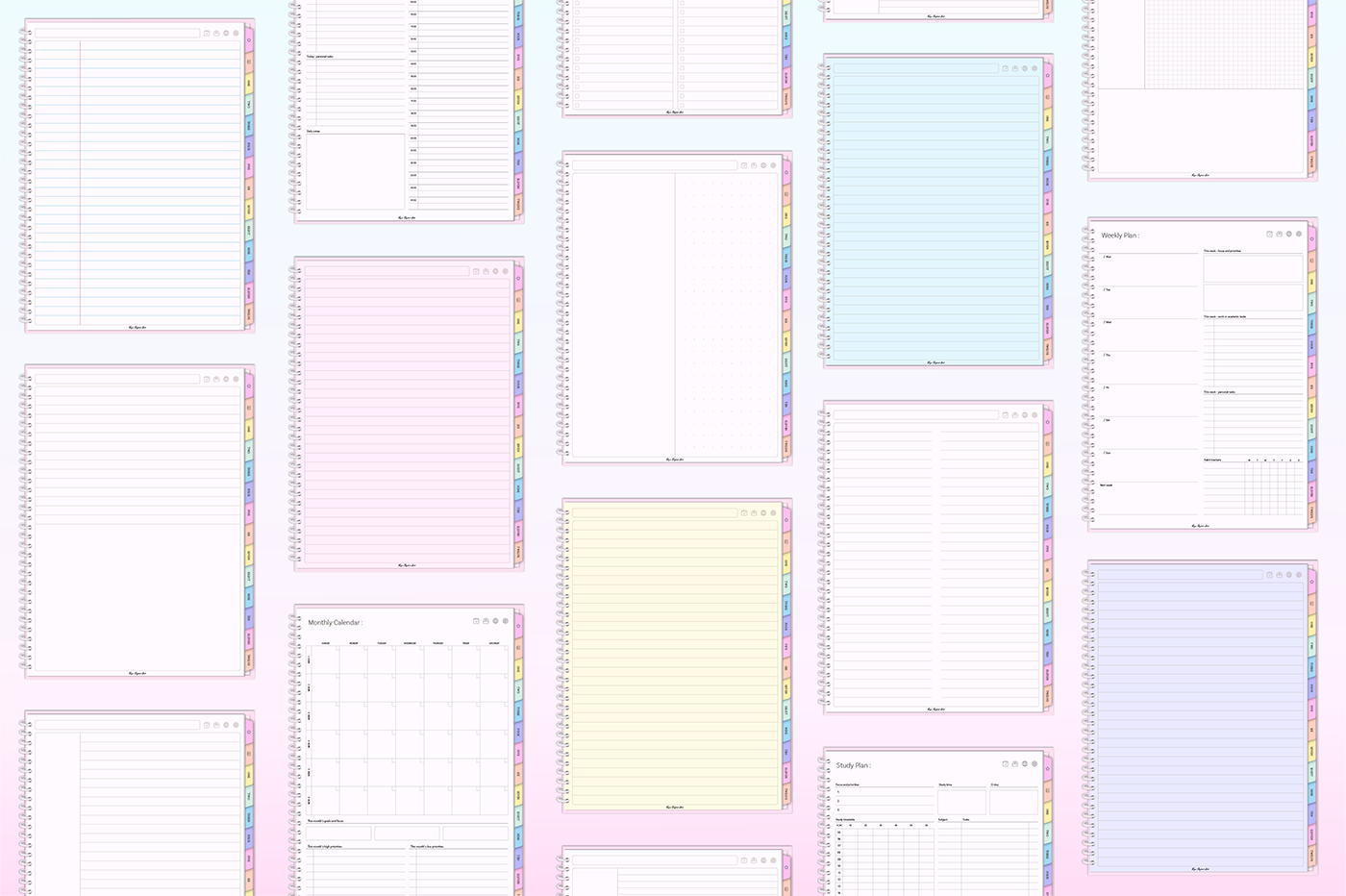 [Page Composition] - User Guide - Apple & Google Calendar Integration - Shortcuts Integration (Utility, Google Translate, ChatGPT) - Covers (6) - Binders (12) - Lined - Grid - Plain - Dotted - Legal - Cornell - Planner : Monthly (2 types), Weekly (2 types), Daily, Study Plan - 300+ Stickers