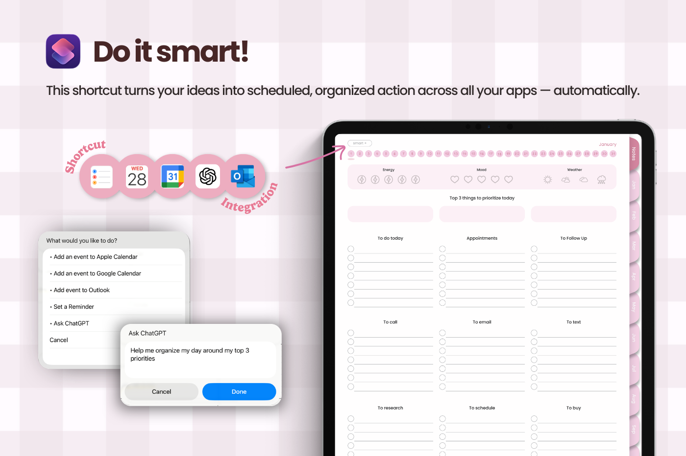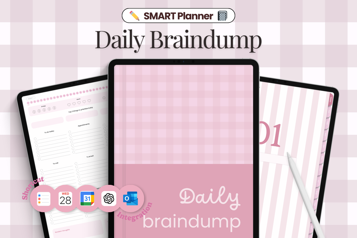 A thoughtfully designed digital daily brain dump that gives you space to clear your mind every single day of the year. Smart integration: - Sync with Apple Calendar, Google Calendar, Reminders, and Outlook. - Use ChatGPT to generate task lists, summarize progress, or brainstorm new project ideas. Features: - 365 daily brain dump templates - 10 notes sections - 25 note-taking templates