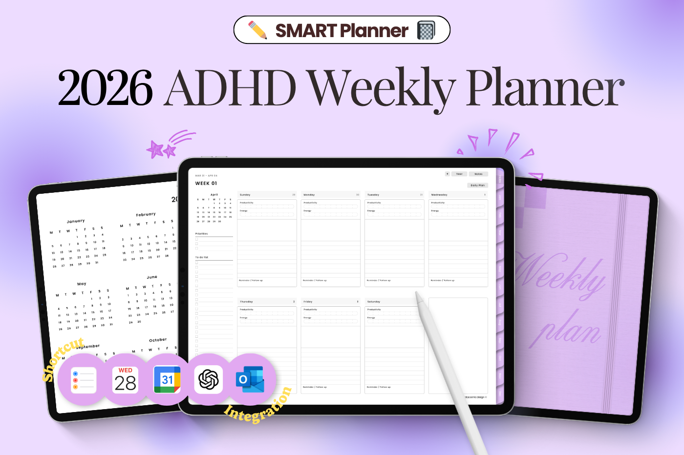 Boost productivity with the 2026 Digital Planner Sync tasks seamlessly with Apple Calendar, Google Calendar, Outlook, ChatGPT, and Reminders using Shortcuts integration. Features: - +60 Covers - 10 Daily planner layouts - ADHD Weekly layout - 10 Notebook sections