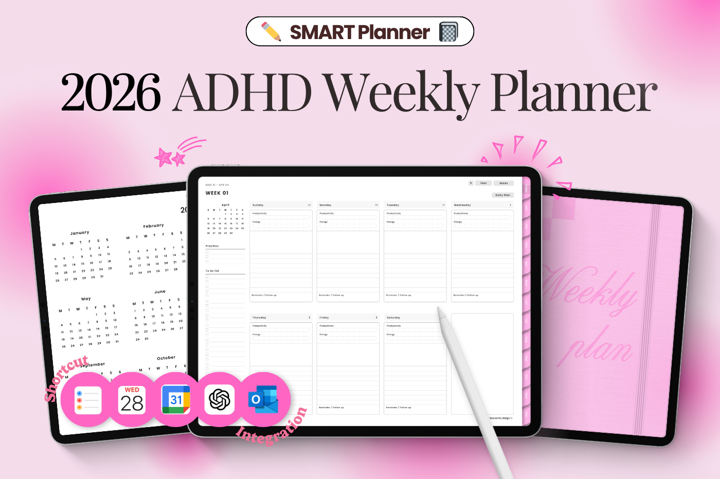 Boost productivity with the 2026 Digital Planner Sync tasks seamlessly with Apple Calendar, Google Calendar, Outlook, ChatGPT, and Reminders using Shortcuts integration. Features: - +60 Covers - 10 Daily planner layouts - ADHD Weekly layout - 10 Notebook sections