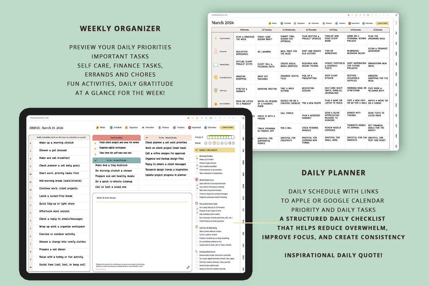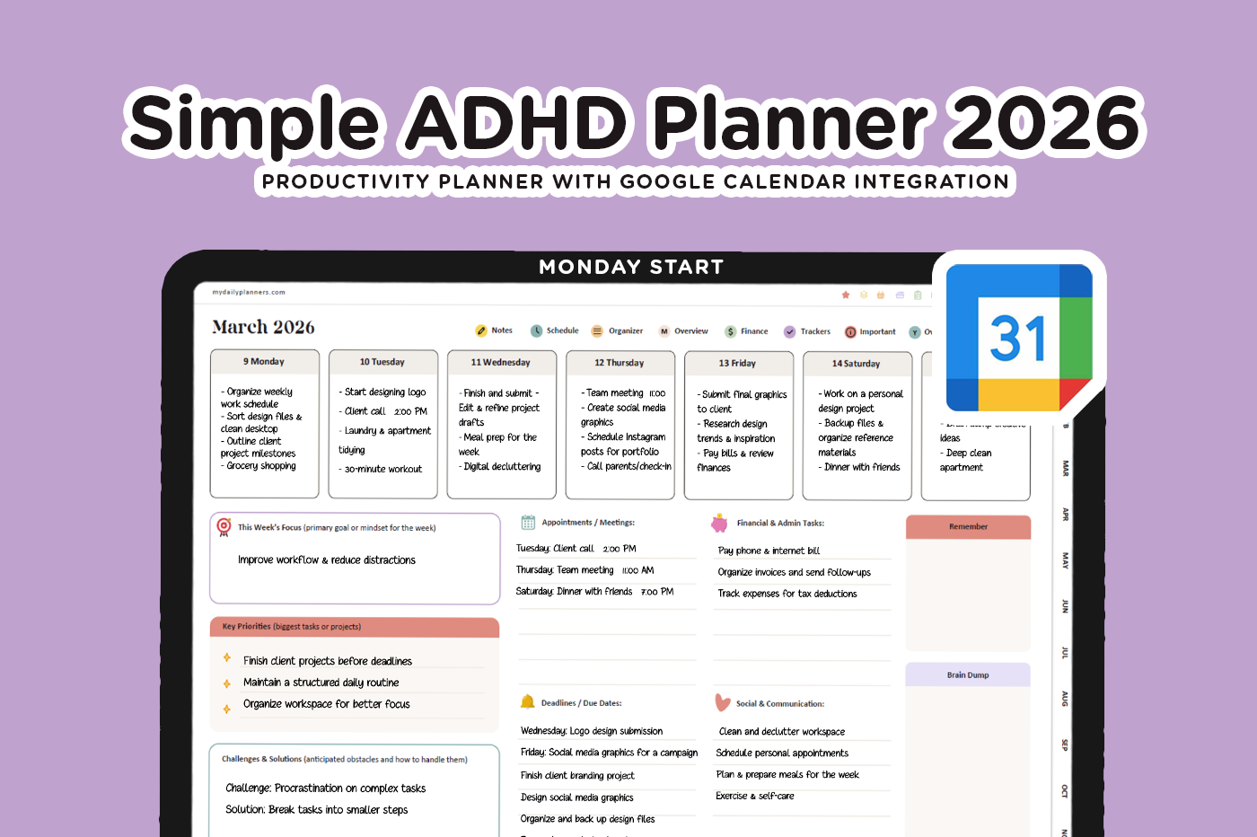 Stay focused and organized with the ADHD Digital Planner, designed to reduce overwhelm and improve productivity. Featuring hyperlinked calendars, structured daily checklists, and category-based task organization, it helps you manage work, personal life, and self-care effortlessly. Includes monthly and weekly planners, budget tracker, routine and meal planners, notes, and more.