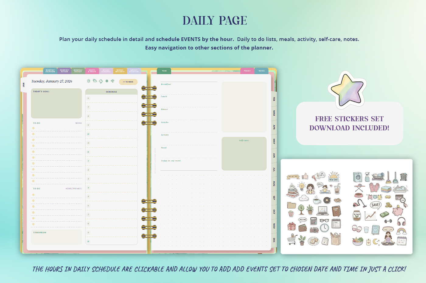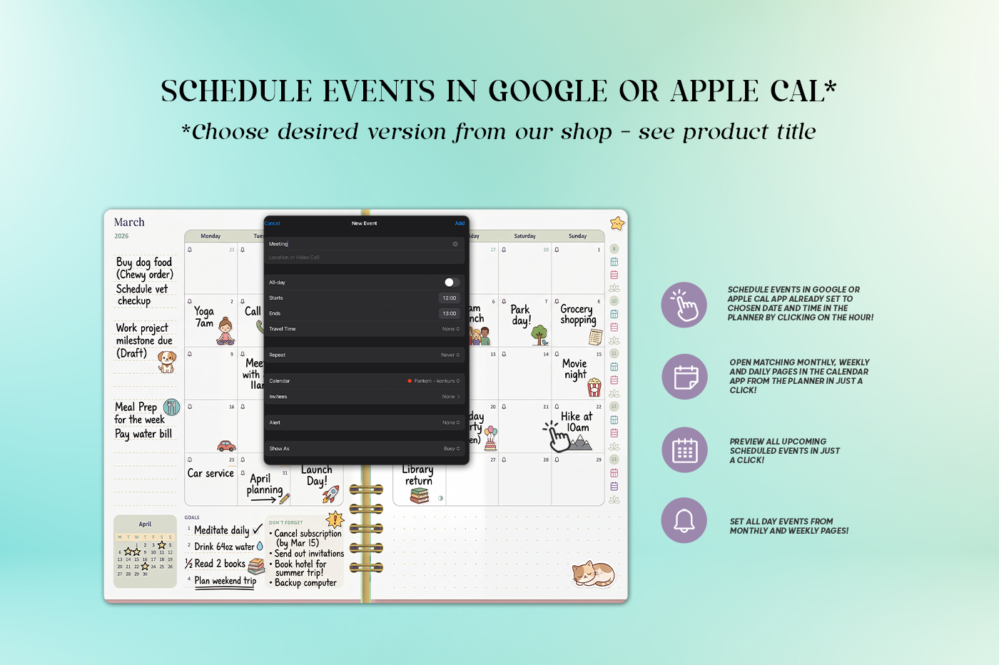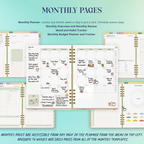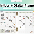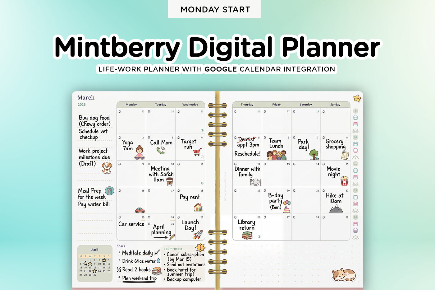 A soothing mint -toned digital planner designed to bring calm and clarity to your day. With full Google Calendar integration, you can set notifications, preview monthly, weekly, and daily layouts, view upcoming events at a glance. Thoughtfully organized pages include dated monthly, weekly, and daily planning, wellness, budget, habits, mood tracking and project folders for effortless, all-in-one life planning.
