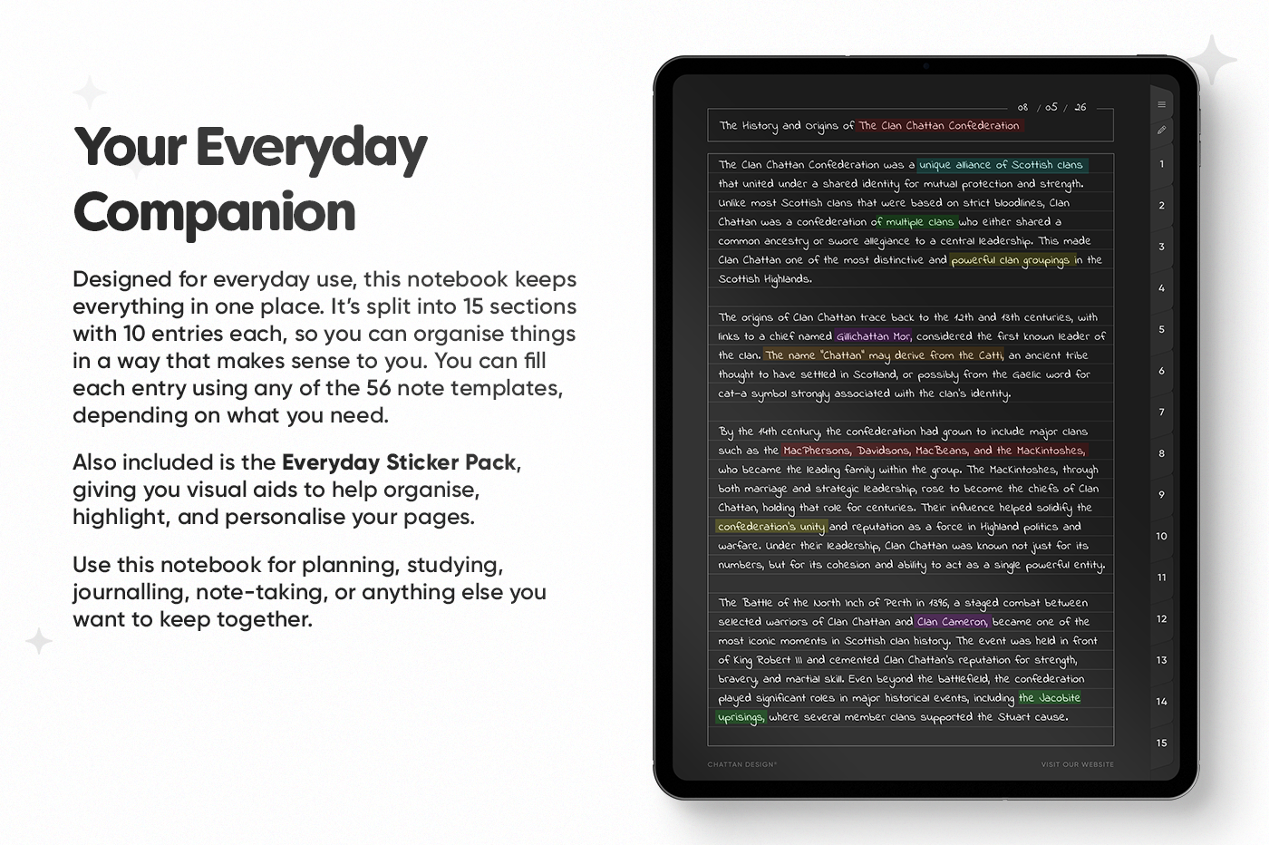 Chattan Design is a graphic design studio based in Scotland that specialises in creating sleek and modern digital planners. Focused on productivity, our mission is to create functional and intuitive tools for enhanced organisation. Our designs effortlessly integrate into the lives of professionals, students, and efficiency-seekers. Transform your planning into an enjoyable experience.