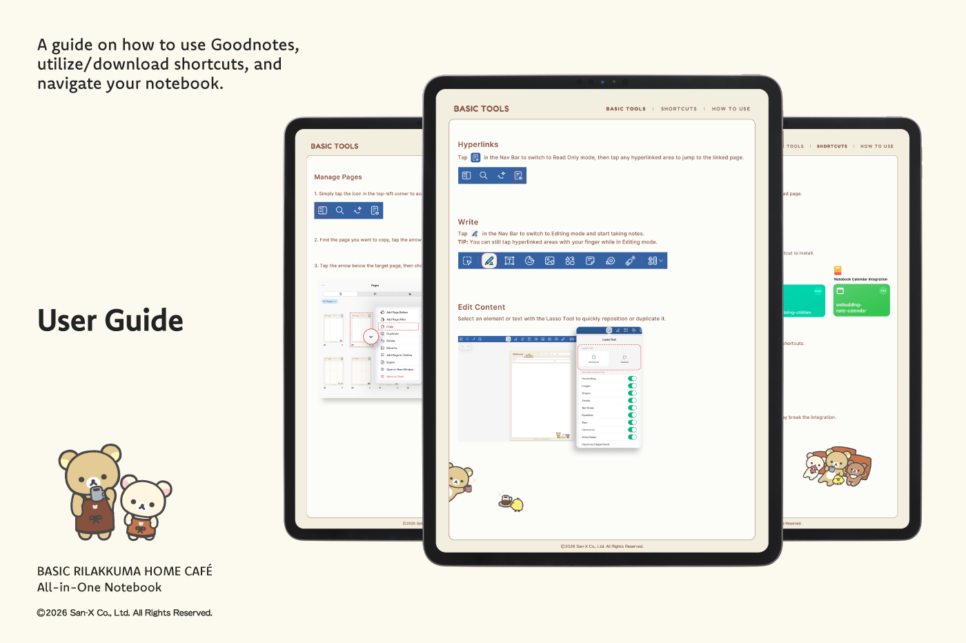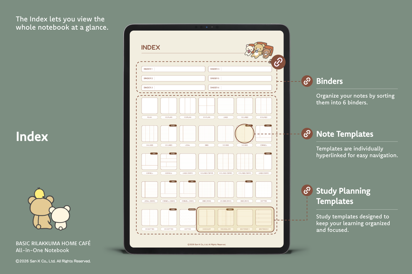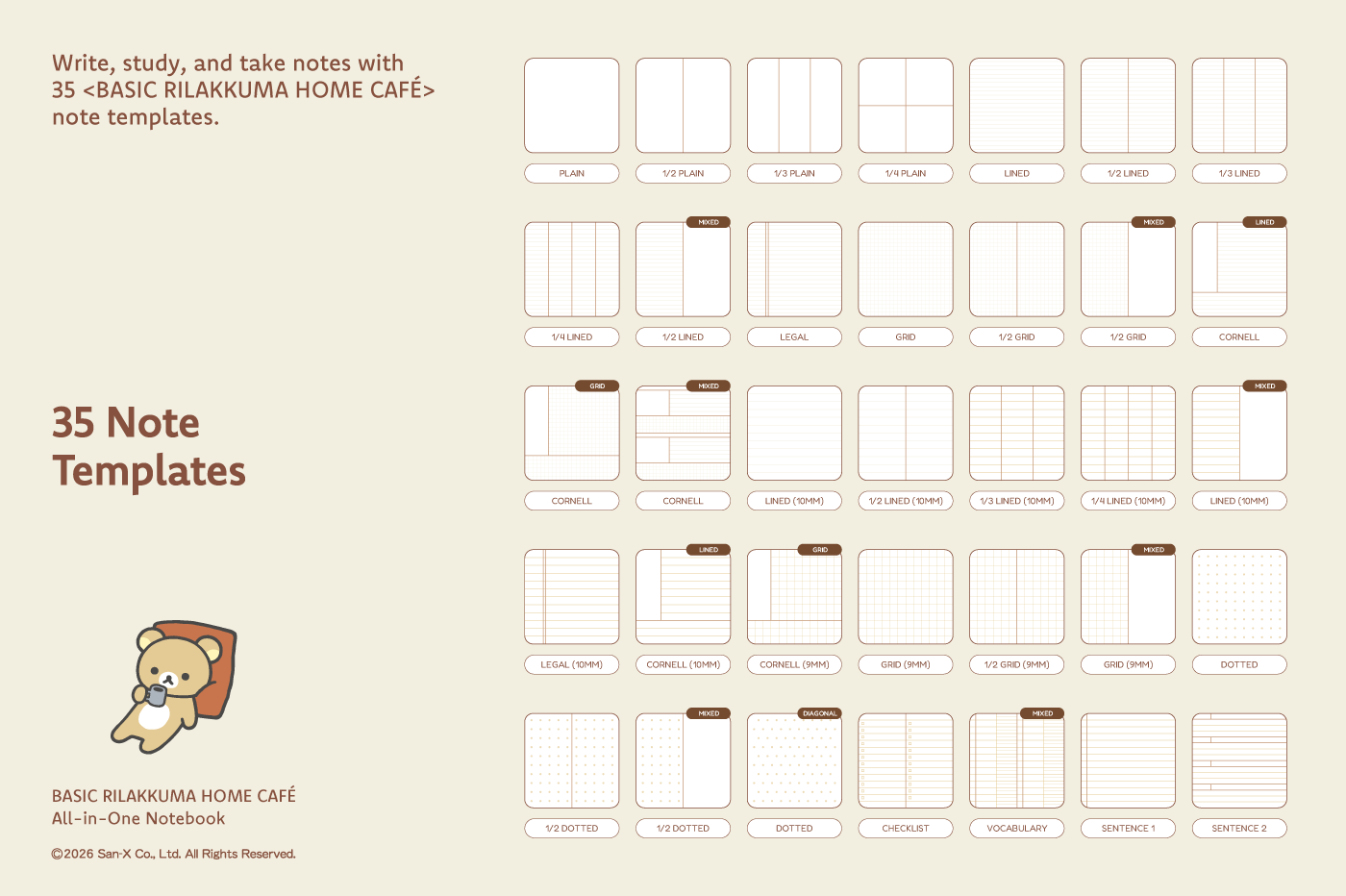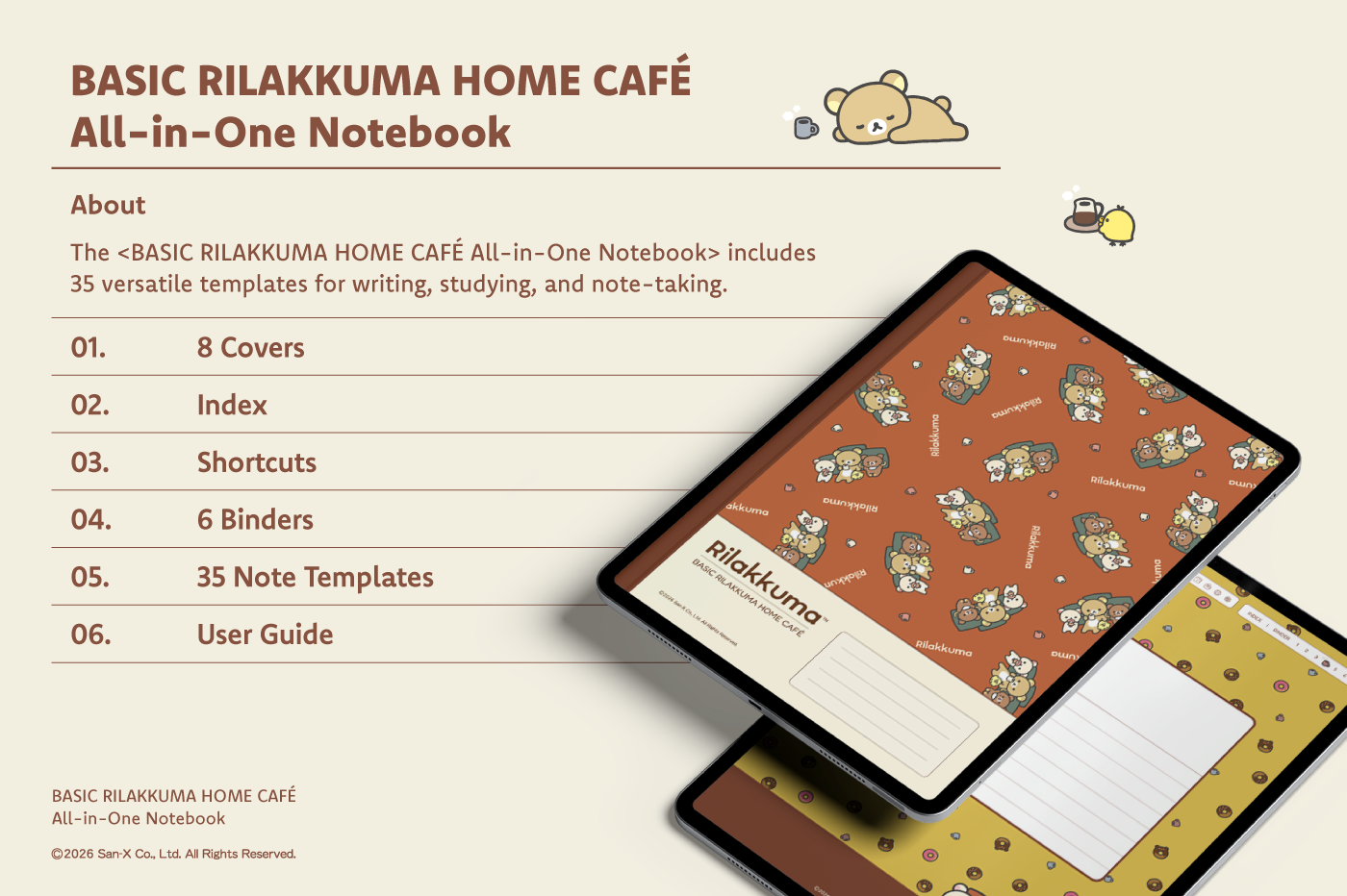 This product is for personal use only. Any unlawful use of the content may result in the revocation of access. [Page Composition] - Apple & Google Calendar Integrated (iOS devices only) - Shortcuts Integrated (Calendar, Utility, Translate, ChatGPT) - User Guide - Covers (8) - Binder (6) - Plain (4 types) - Lined (10 types) - Legal (2 types) - Grid (6 types) - Cornell (6 types) - Dotted (4 types) - Checklist - Vocabulary - Sentence (2) This product is permitted under a License agreement between San-X Co., Ltd. and Webudding Inc., and unauthorized reproduction of this product and its characters is prohibited.