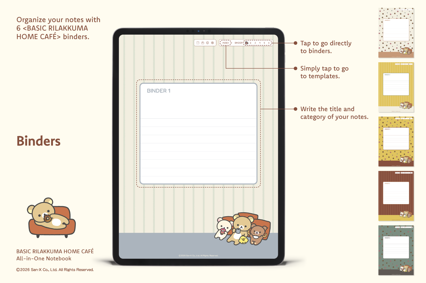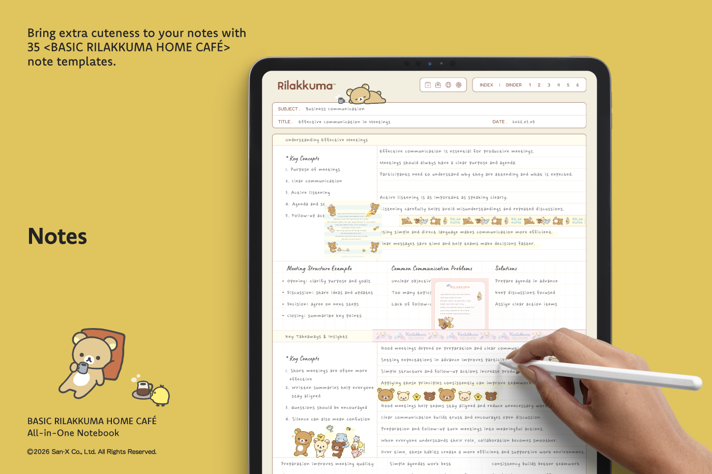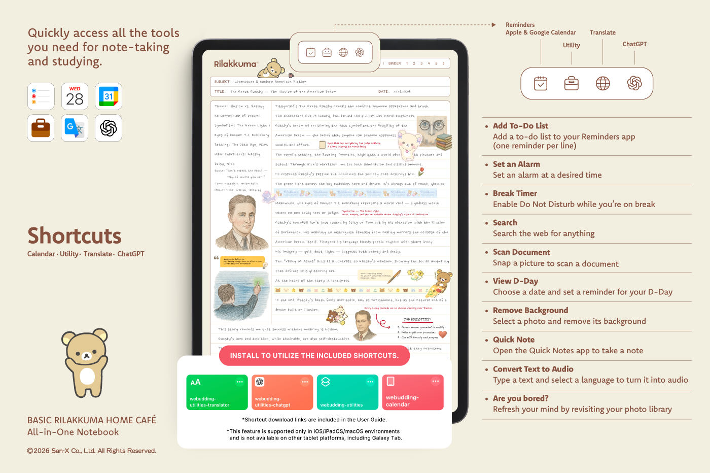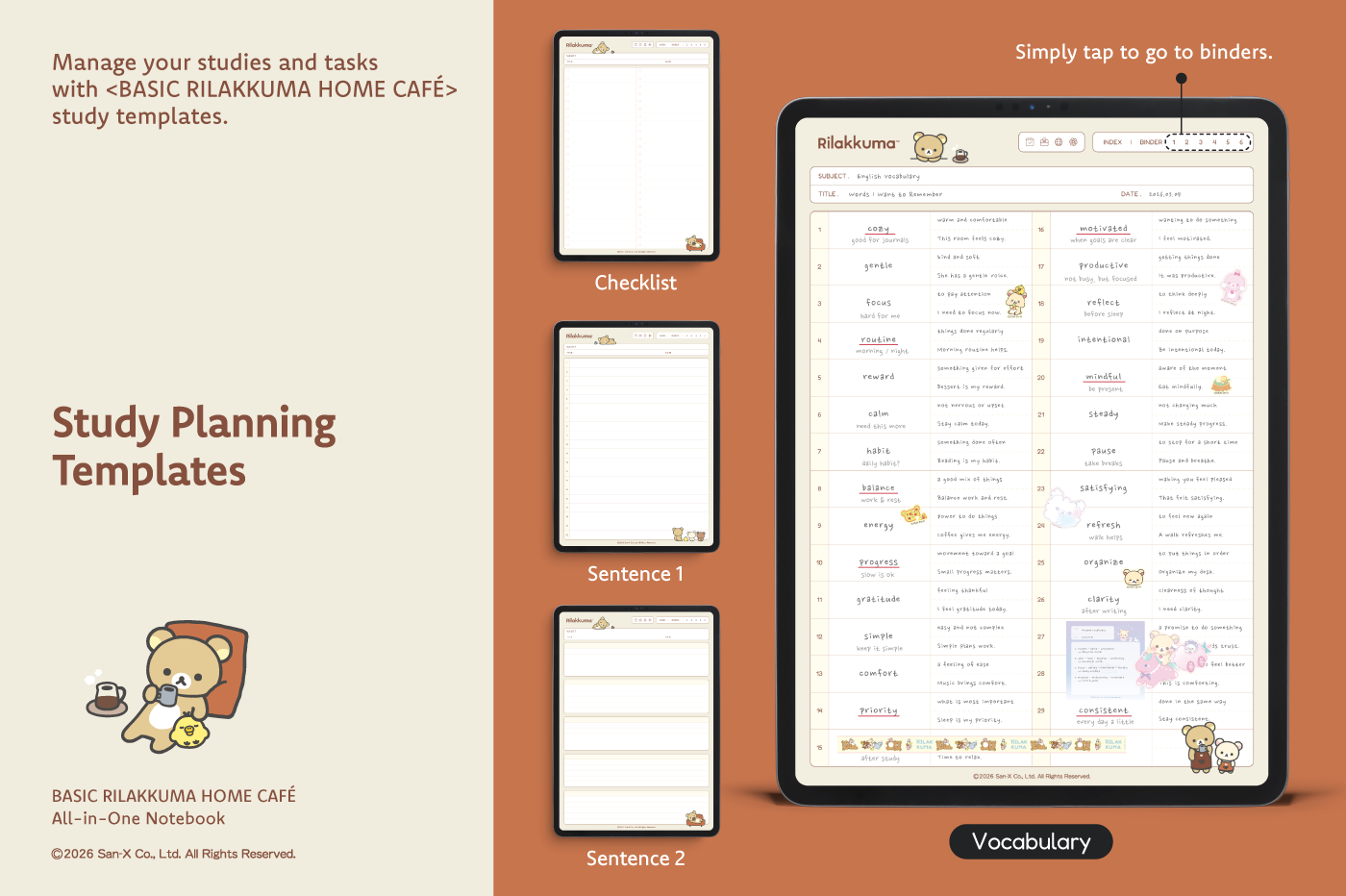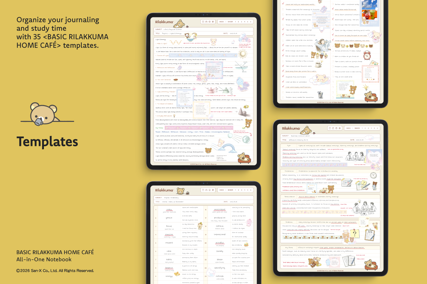 This product is for personal use only. Any unlawful use of the content may result in the revocation of access. [Page Composition] - Apple & Google Calendar Integrated (iOS devices only) - Shortcuts Integrated (Calendar, Utility, Translate, ChatGPT) - User Guide - Covers (8) - Binder (6) - Plain (4 types) - Lined (10 types) - Legal (2 types) - Grid (6 types) - Cornell (6 types) - Dotted (4 types) - Checklist - Vocabulary - Sentence (2) This product is permitted under a License agreement between San-X Co., Ltd. and Webudding Inc., and unauthorized reproduction of this product and its characters is prohibited.